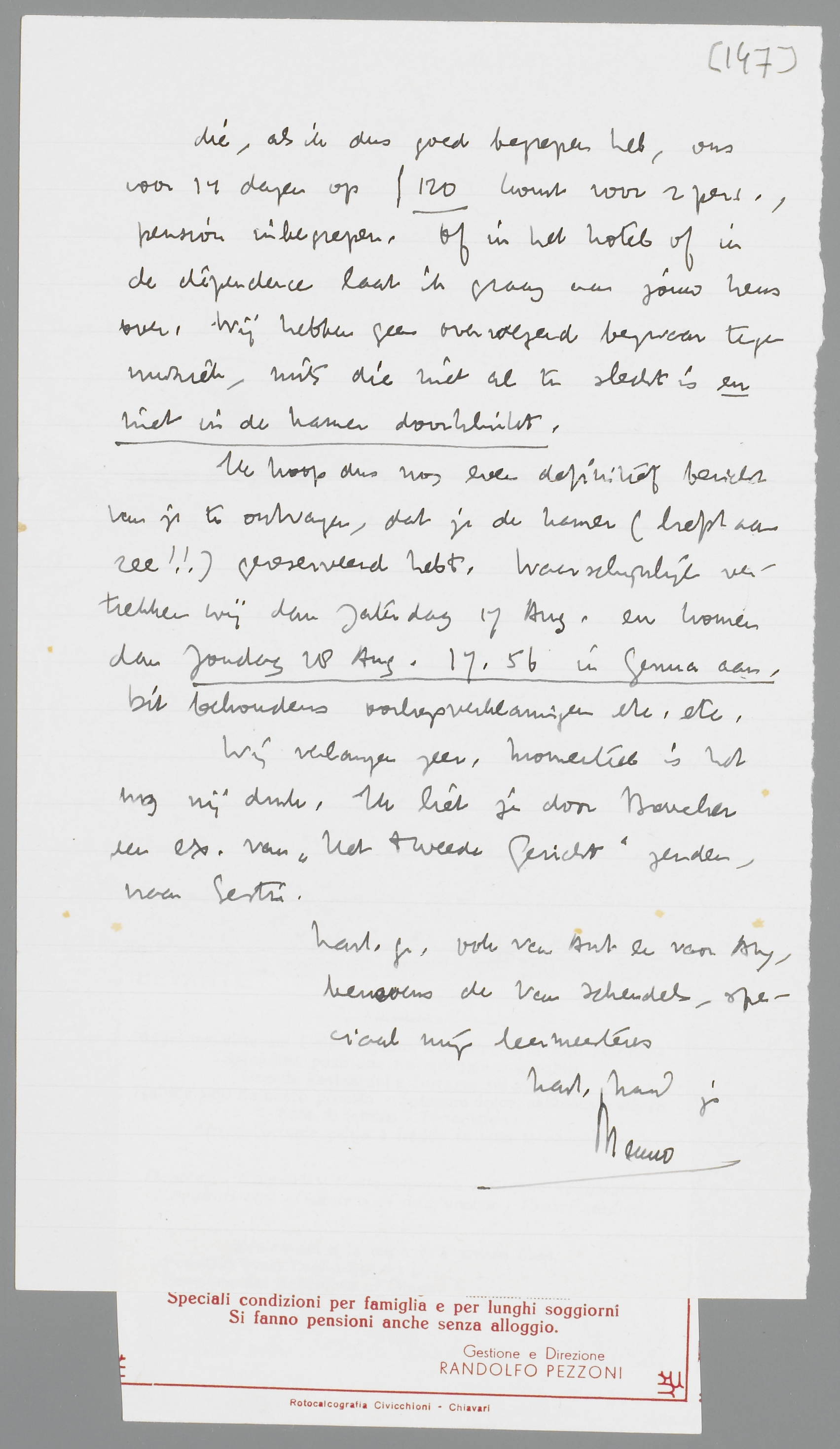 Ik hoop dus nog even definitief bericht van je te ontvangen, dat je de kamer (liefst aan zee!!) gereserveerd hebt. Waarschijnlijk vertrekken wij dan Zaterdag 17 Aug. en komen dan Zondag 18 Aug. 17.56 in Genua aan. Dit behoudens oorlogsverklaringen etc. etc.