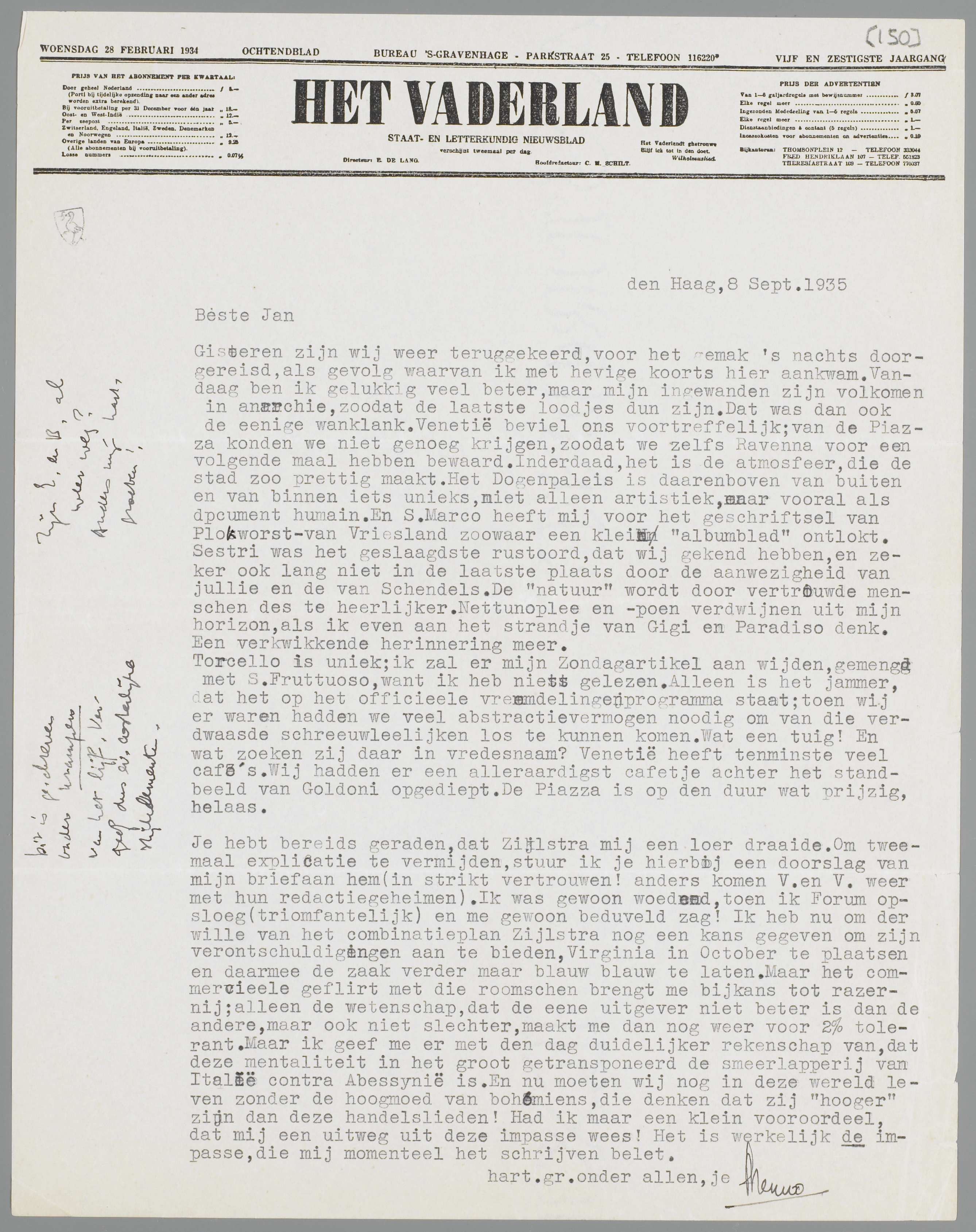 Gisteren zijn wij weer teruggekeerd, voor het gemak 's nachts doorgereisd, als gevolg waarvan ik met hevige koorts hier aankwam. Vandaag ben ik gelukkig veel beter, maar mijn ingewanden zijn volkomen in anarchie, zoodat de laatste loodjes dun zijn. Dat was dan ook de eenige wanklank. Venetië beviel ons voortreffelijk; van de Piazza konden we niet genoeg krijgen, zoodat we zelfs Ravenna voor een volgende maal hebben bewaard. Inderdaad, het is de atmosfeer, die de stad zoo prettig maakt. Het Dogenpaleis is daarenboven van buiten en van binnen iets unieks, niet alleen artistiek, maar vooral als document humain. En S.Marco heeft voor mij het geschriftsel van Plokworst-van Vriesland zoowaar een klein ‘albumblad’ ontlokt. Sestri was het geslaagdste rustoord, wat wij gekend hebben, en zeker ook lang niet in de laatste plaats door de aanwezigheid van jullie en de van Schendels. De ‘natuur’ wordt door vertrouwde menschen des te heerlijker. Nettunoplee en -poen verdwijnen uit mijn horizon, als ik even aan het strandje van Gigi en Paradiso denk. Een verkwikkende herinnering meer.