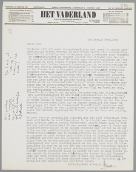Je hebt bereids geraden, dat Zijlstra mij een loer draaide. Om tweemaal explicatie te vermijden, stuur ik je hierbij een doorslag van mijn brief aan hem (in strikt vertrouwen! anders komen V. en V. weer met hun redactiegeheimen). Ik was gewoon woedend, toen ik Forum opsloeg (triomfantelijk) en me gewoon beduveld zag! Ik heb nu om der wille van het combinatieplan Zijlstra nog een kans gegeven om zijn verontschuldigingen aan te bieden, Virginia in October te plaatsen en daarmee de zaak verder maar blauw blauw te laten. Maar het commercieele geflirt met die roomschen brengt me bijkans tot razernij; alleen de wetenschap, dat de eene uitgever niet beter is dan de andere, maar ook niet slechter, maakt me dan nog weer voor 2% tolerant. Maar ik geef me er met den dag duidelijker rekenschap van, dat deze mentaliteit in het groot getransponeerd de smeerlapperij van Italië contra Abessynië is. En nu moeten wij nog in deze wereld leven zonder de hoogmoed van bohémiens, die denken dat zij ‘hooger’ zijn dan deze handelslieden! Had ik maar een klein vooroordeel, dat mij een uitweg uit deze impasse wees! Het is werkelijk de impasse, die mij momenteel het schrijven belet.