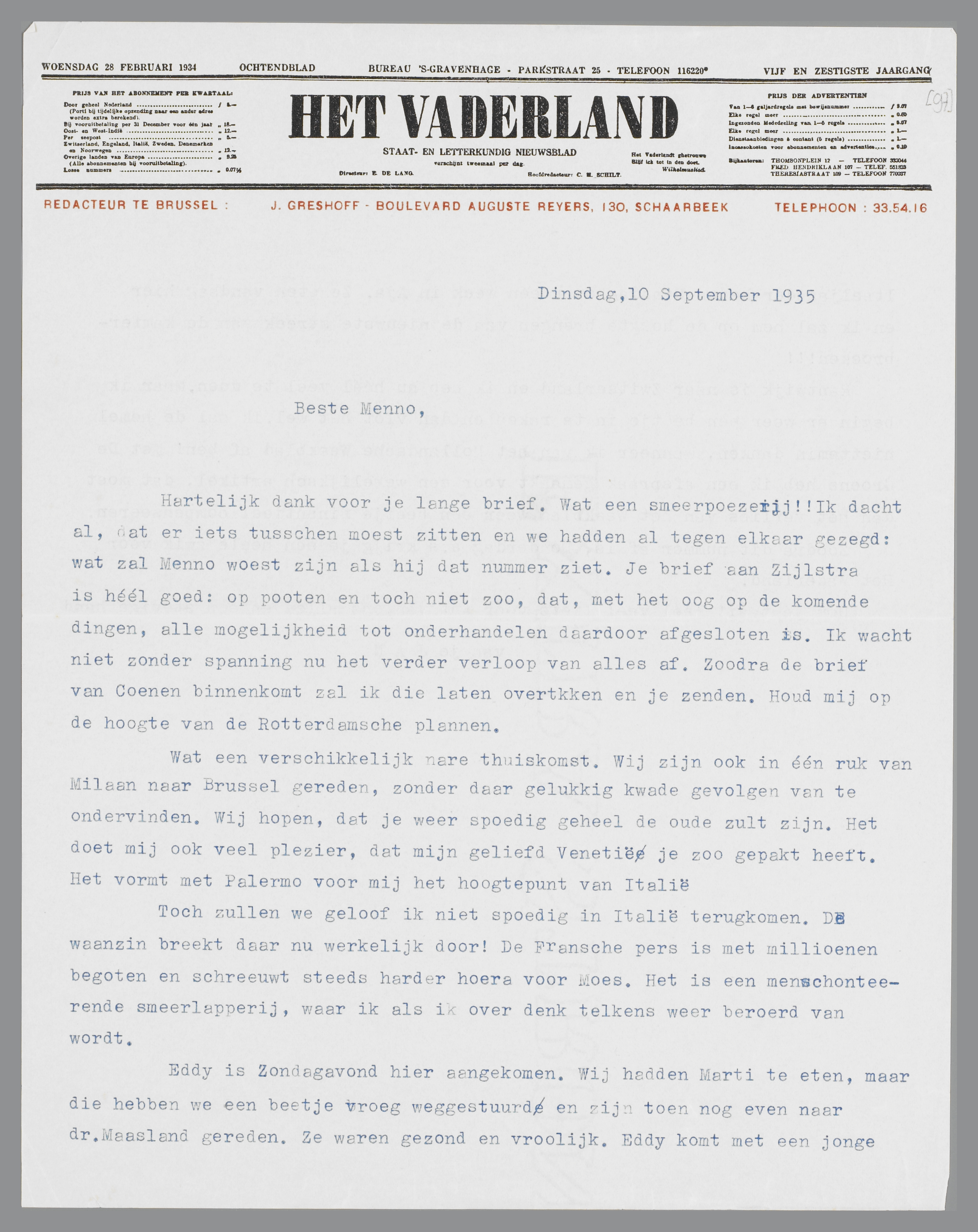 Hartelijk dank voor je lange brief. Wat een smeerpoezerij!! Ik dacht al, dat er iets tusschen moest zitten en we hadden al tegen elkaar gezegd: wat zal Menno woest zijn als hij dat nummer ziet. Je brief aan Zijlstra is héél goed: op pooten en toch niet zoo, dat, met het oog op de komende dingen, alle mogelijkheid tot onderhandelen daardoor afgesloten is. Ik wacht niet zonder spanning nu het verder verloop van alles af. Zoodra de brief van Coenen binnenkomt zal ik die laten overtikken en je zenden. Houd mij op de hoogte van de Rotterdamsche plannen.