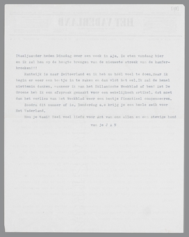 Rantwijk is naar Zwitserland en ik heb nu héél veel te doen. Maar ik begin er weer een beetje in te raken en dan vlot het wel. Ik zal de hemel niettemin danken, wanneer ik van het Hollandsche Weekblad af ben! Met De Groene heb ik een afspraak gemaakt voor een wekelijksch artikel, dat moet dan het verlies van het Weekblad weer een beetje finantieel compenseeren.