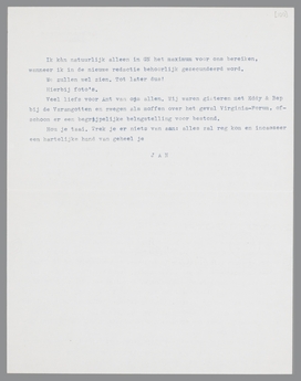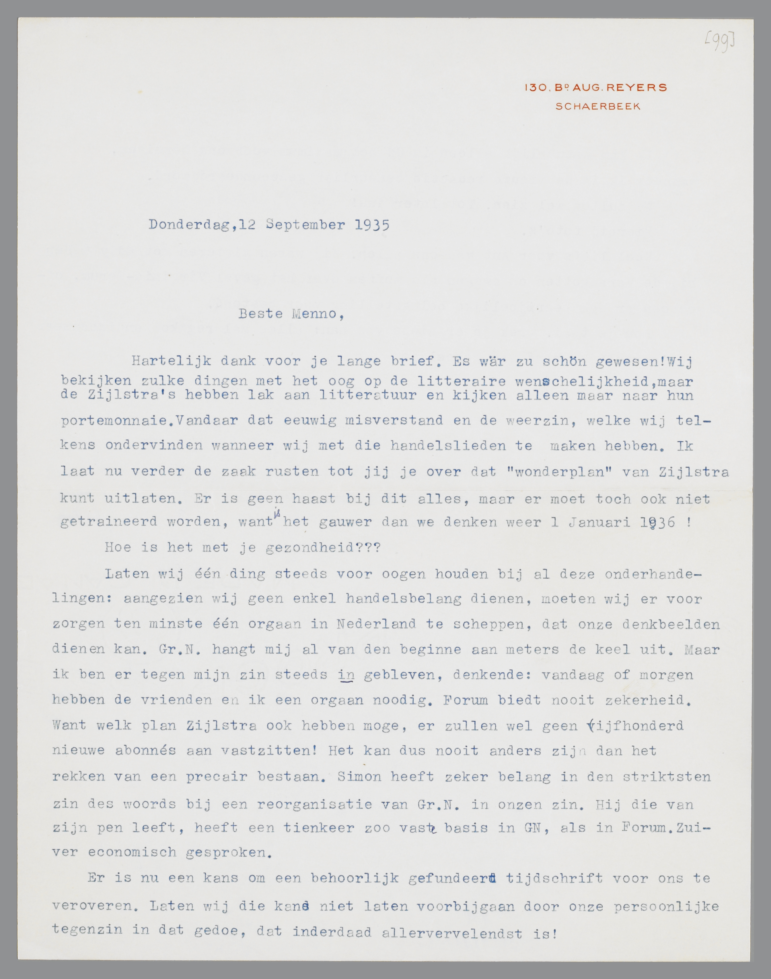 Laten wij één ding steeds voor oogen houden bij al deze onderhandelingen: aangezien wij geen enkel handelsbelang dienen, moeten wij er voor zorgen ten minste één orgaan in Nederland te scheppen, dat onze denkbeelden dienen kan. Gr. N. hangt mij al van den beginne aan meters de keel uit. Maar ik ben er tegen mijn zin steeds in gebleven, denkende: vandaag of morgen hebben de vrienden en ik een orgaan noodig. Forum biedt nooit zekerheid. Want welk plan Zijlstra ook hebben moge, er zullen wel geen vijfhonderd nieuwe abonnés aan vastzitten! Het kan dus nooit anders zijn dan het rekken van een precair bestaan. Simon heeft zeker belang in den striksten zin des woords bij een reorganisatie van Gr. N. in onzen zin. Hij die van zijn pen leeft, heeft een tienkeer zoo vaste basis in GN, als in Forum. Zuiver economisch gesproken.