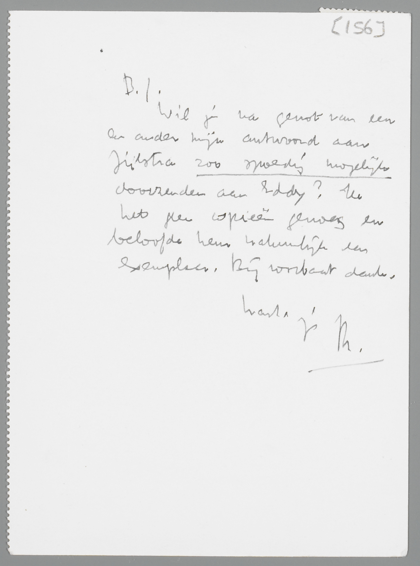 Wil je na genot van een en ander mijn antwoord aan Zijlstra zoo spoedig mogelijk doorzenden aan Eddy? Ik heb geen copieën genoeg en beloofde hem natuurlijk een exemplaar. Bij voorbaat dank.