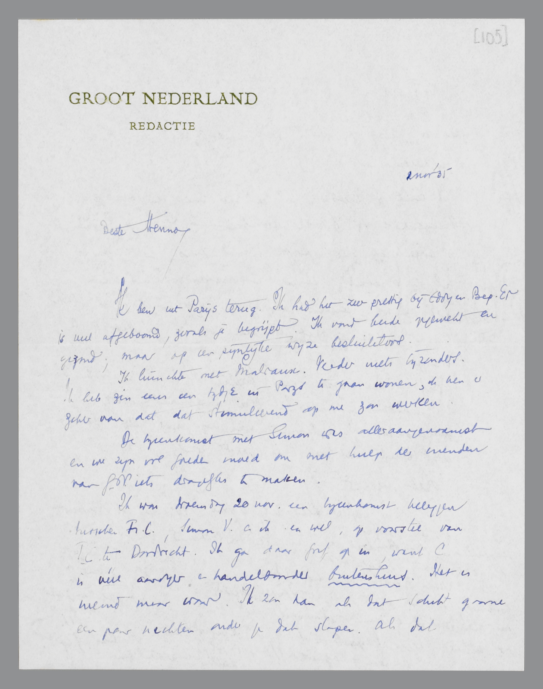 Ik ben uit Parijs terug. Ik had het zeer prettig bij Eddy en Bep. Er is veel afgeboomd, zooals je begrijpt. Ik vond beide opgewekt en gezond; maar op een pijnlijke wijze besluiteloos.