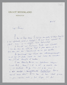 Ik zend je hierbij de revisie van een boekje dat binnenkort bij [onleesbaar] verschijnt. Zou je (áls je er eventueel over schrijft) niet eens het genre, n.l. de boutade kunnen bespreken? Want de Hollandsche Heeren begrijpen niet goed wat dat eigentlijk is en het is wel aardig ze dat bij te brengen.