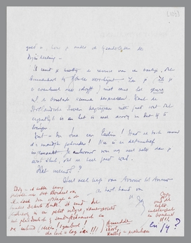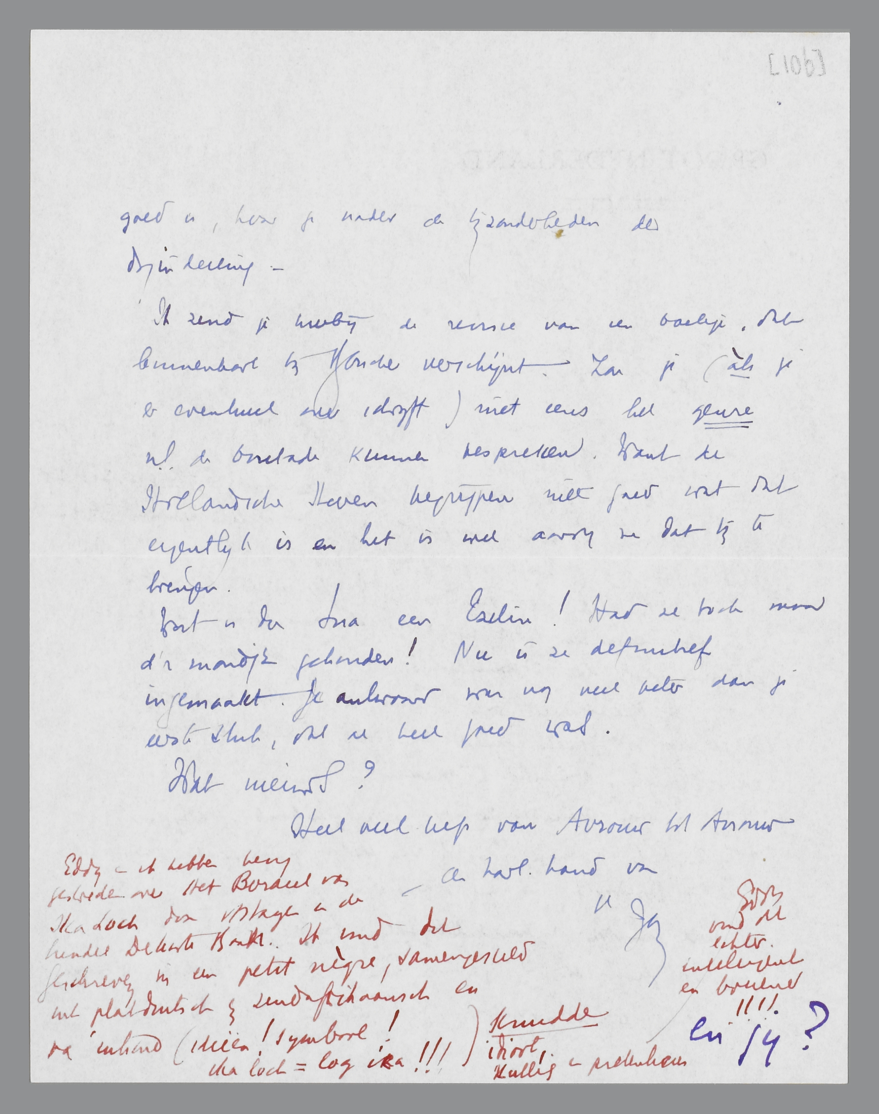 Eddy en ik hebben hevig gestreden over Het Bordeel van Ika Loch door v.Ostayen in de bundel De [twee woorden onleesbaar]. Ik vind dit geschreven in een petit nègre, samengesteld uit platduitsch en zuidafrikaansch en [van] inhoud (ideeën! symbool! ika loch = log ika!!) knudde idioot, kullig en pretentieus.