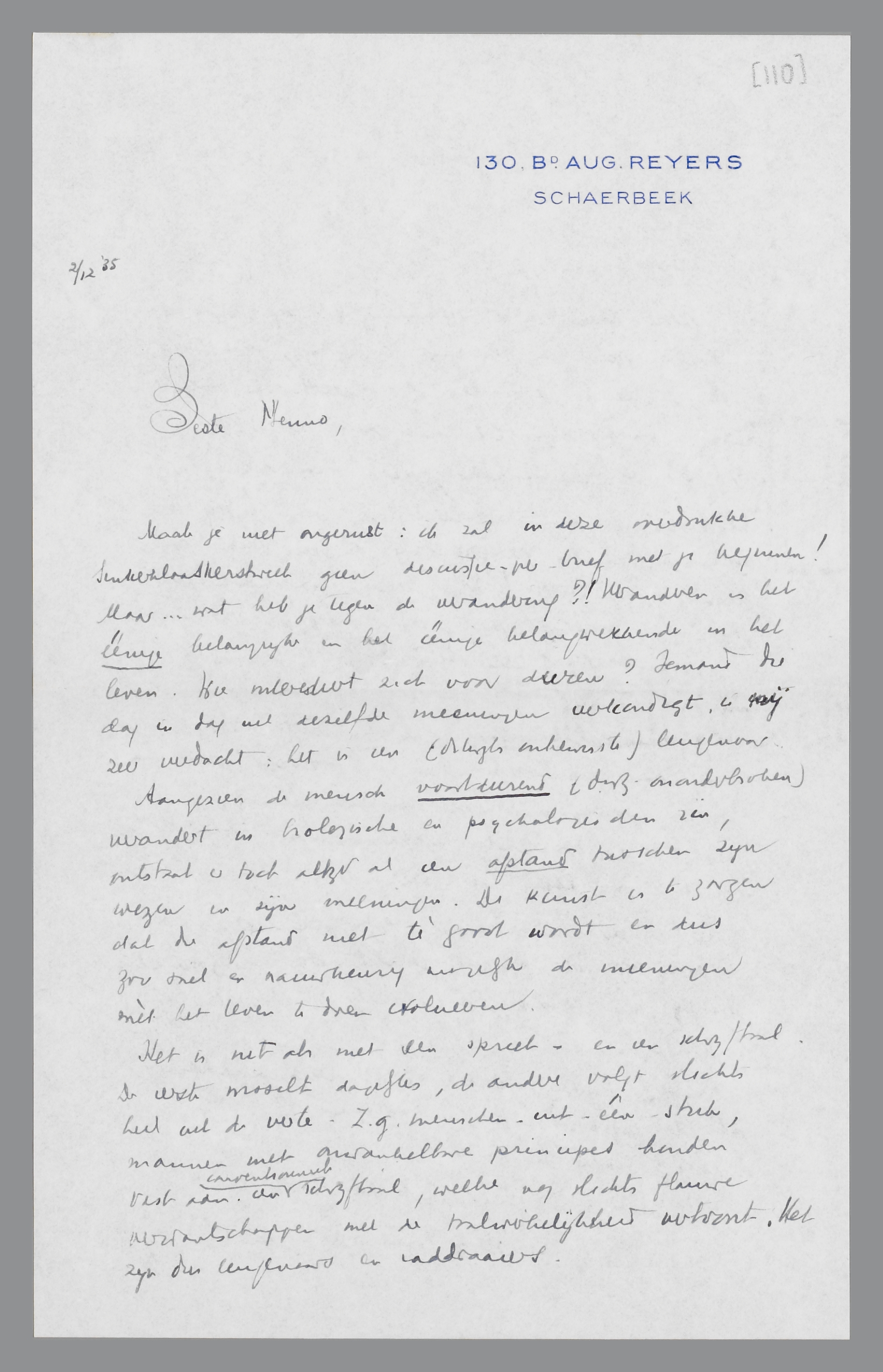 Maak je niet ongerust: ik zal in deze overdrukke Sinterklaaskerstweek geen discussie-per-brief met je beginnen! Maar... wat heb je tegen de verandering?! Veranderen is het éénige belangrijke en het éénige belangwekkende in het leven. Wie interesseert zich voor dieren? Iemand die dag in dag uit dezelfde meeningen verkondigt is mij zeer verdacht: het is een (dikwijls onbewuste) leugenaar.