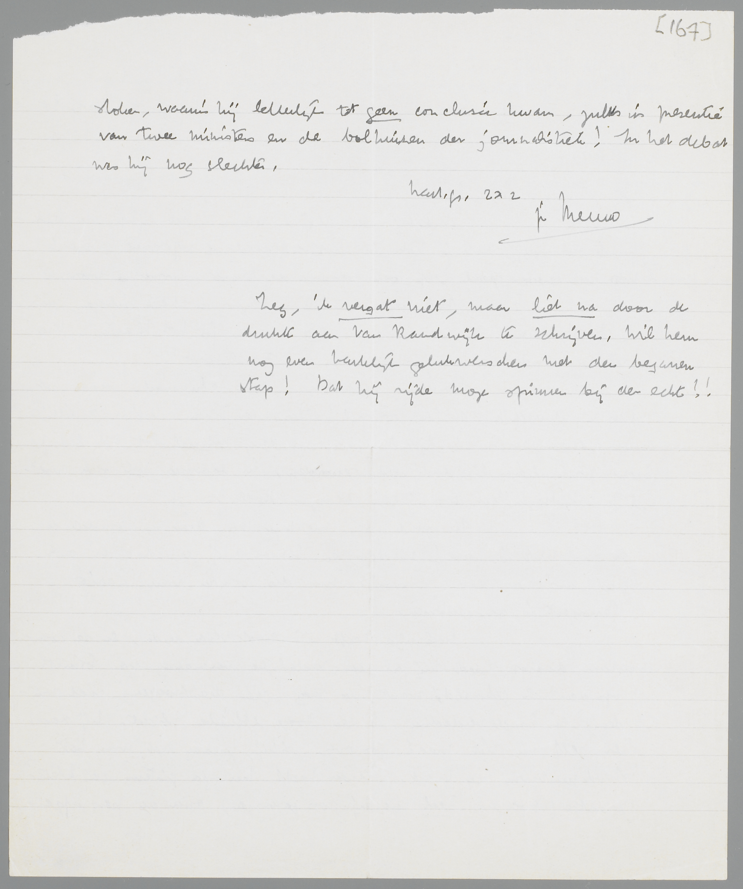 Vervelend, dat Coenen zoo chicaneert. Maar het was te verwachten, en ik voorspel jullie meer fraais. Het is duidelijk: voor deze persoon is Gr. Ned. allang een middel tot het bedrijven van particuliere liefdadigheid geworden. En daarmee zal zich moeilijk verdragen het door jullie beoogde doel!