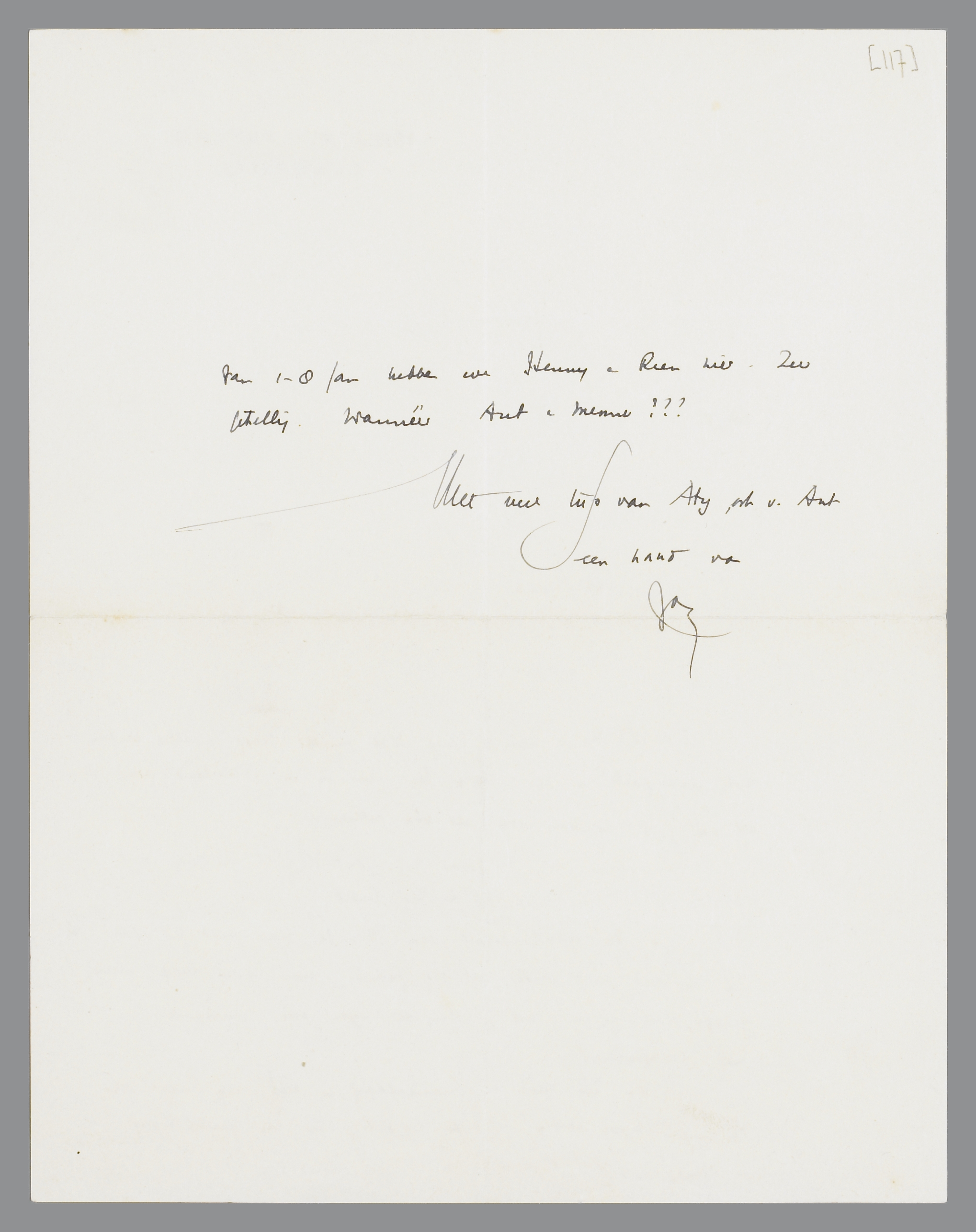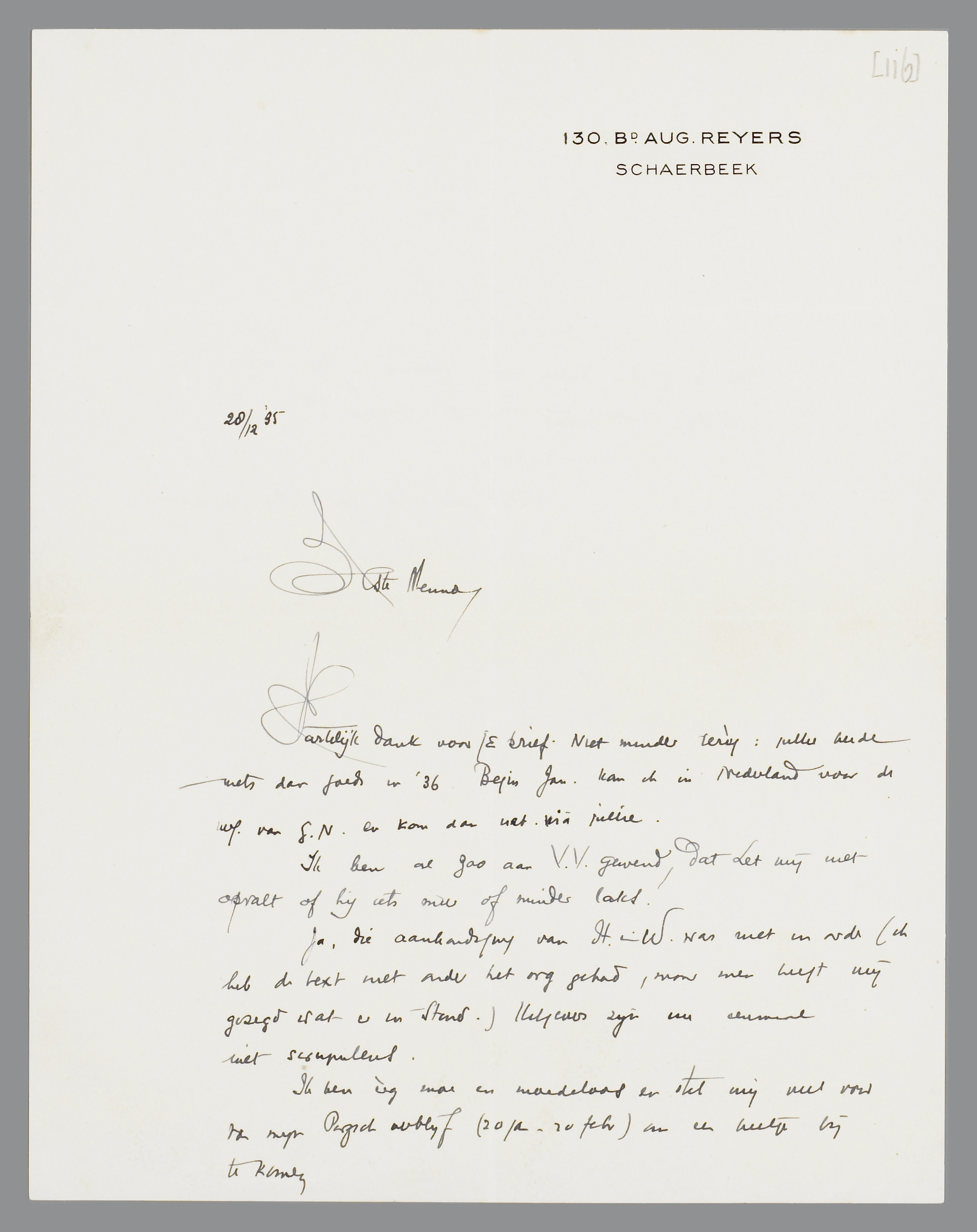 Hartelijk dank voor je brief. Niet minder terúg: jullie beiden niets dan goeds in '36. Begin Jan. kom ik in Nederland voor de verg. van G.N. en kom dan nat. via jullie.