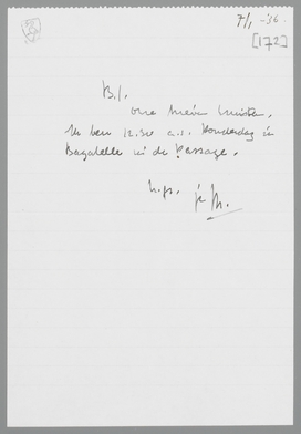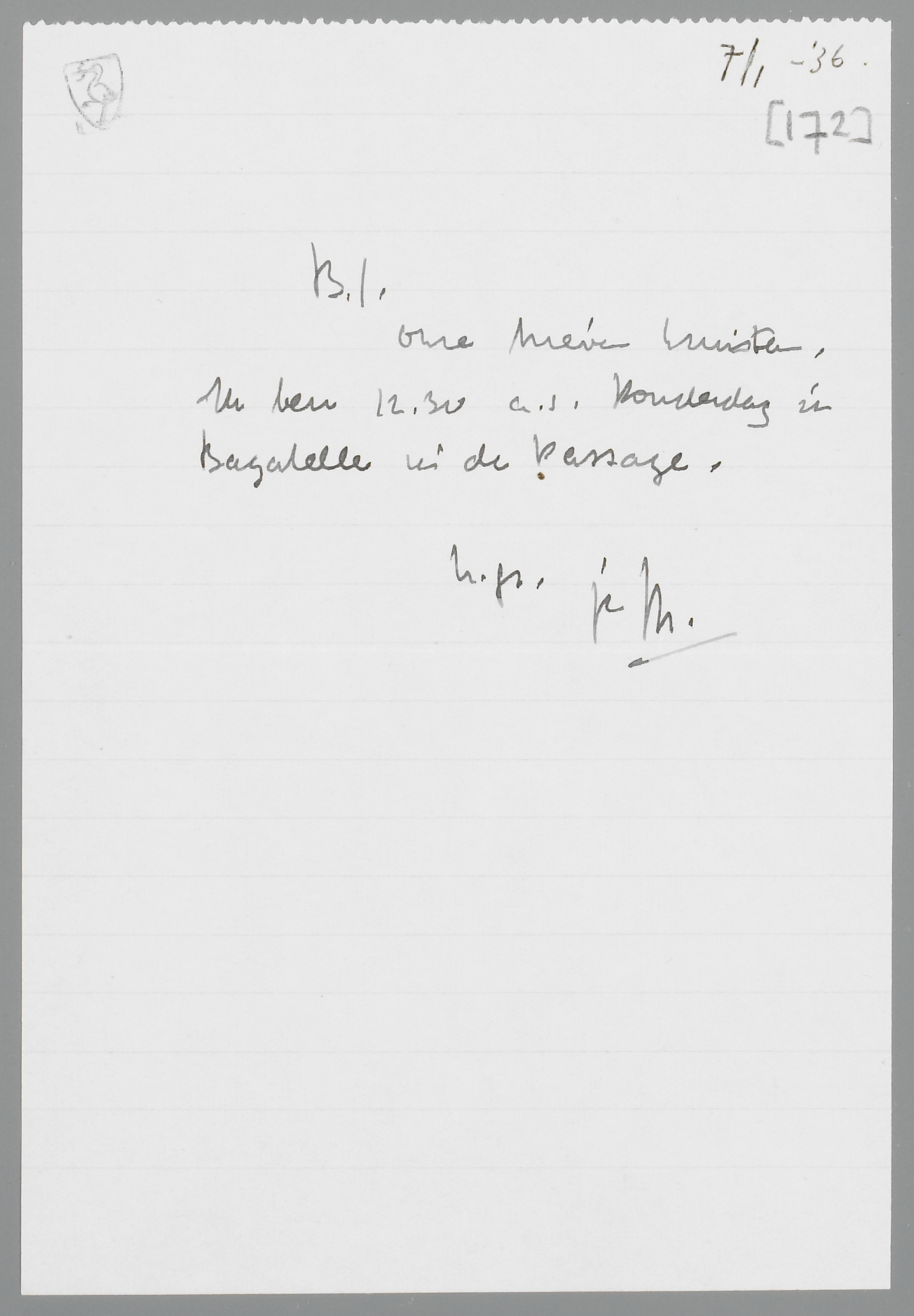 Onze brieven kruisten. Ik ben 12.30 a.s. Donderdag in Bagatelle in de Passage.