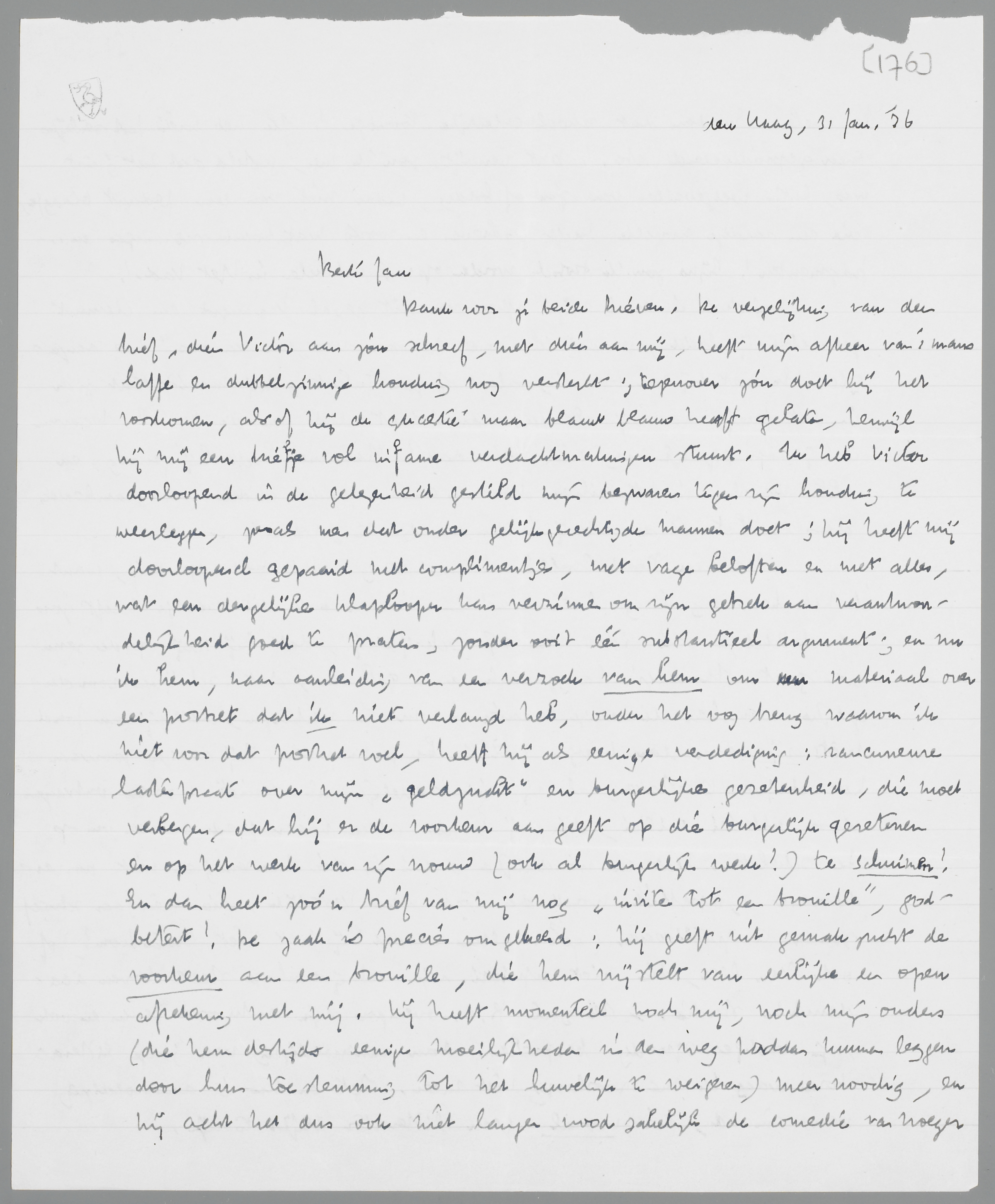 Dank voor je beide brieven. De vergelijking van den brief, dien Victor aan jou schreef, met dien aan mij, heeft mijn afkeer van 's mans laffe en dubbelzinnige houding nog versterkt; tegenover jou doet hij het voorkomen, alsof hij de quaestie maar blauw blauw heeft gelaten, terwijl hij mij een briefje vol infame verdachtmakingen stuurt. Ik heb Victor doorloopend in de gelegenheid gesteld mijn bezwaren tegen zijn houding te weerleggen, zooals men dat onder gelijkgerechtigde mannen doet; hij heeft mij doorloopend gepaaid met complimentjes, met vage beloften en met alles, wat een dergelijke klaplooper kan verzinnen om zijn gebrek aan verantwoordelijkheid goed te praten, zonder ooit één substantieel argument; en nu ik hem, naar aanleiding van een verzoek van hem om materiaal over een portret dat ik niet verlangd heb, onder het oog breng waarom ik niet voor dat portret voel, heeft hij als eenige verdediging: rancuneuze lasterpraat over mijn ‘geldzucht’ en burgerlijke gezetenheid, die moet verbergen, dat hij er de voorkeur aan geeft op die burgerlijk gezetenen en op het werk van zijn vrouw (ook al burgerlijk werk!) te schuimen! En dan heet zoo'n brief van mij nog ‘invite tot een brouille’, godbetert! De zaak is precies omgekeerd: hij geeft uit gemakzucht de voorkeur aan een brouille, die hem vrijstelt van eerlijke en open afrekening met mij. Hij heeft momenteel noch mij, noch mijn ouders (die hem destijds eenige moeilijkheden in den weg hadden kunnen leggen door hun toestemming tot het huwelijk te weigeren) meer noodig, en hij acht het dus ook niet langer noodzakelijk de comedie van vroeger te spelen. En dan dat schoolmeesterlijke toontje! Ik heb niets fatsoenlijks meer geproduceerd etc.! Dat verwijt zou ik me, gesteld dat het juist was, laten welgevallen van jou of Eddy, maar niet van een pedant blaagje, die een aardige novelle heeft geschreven en voorts wat boekbesprekinkjes en... fragmenten! Bijna zou ik trotsch worden op mijn artikelen in Het Vad.!