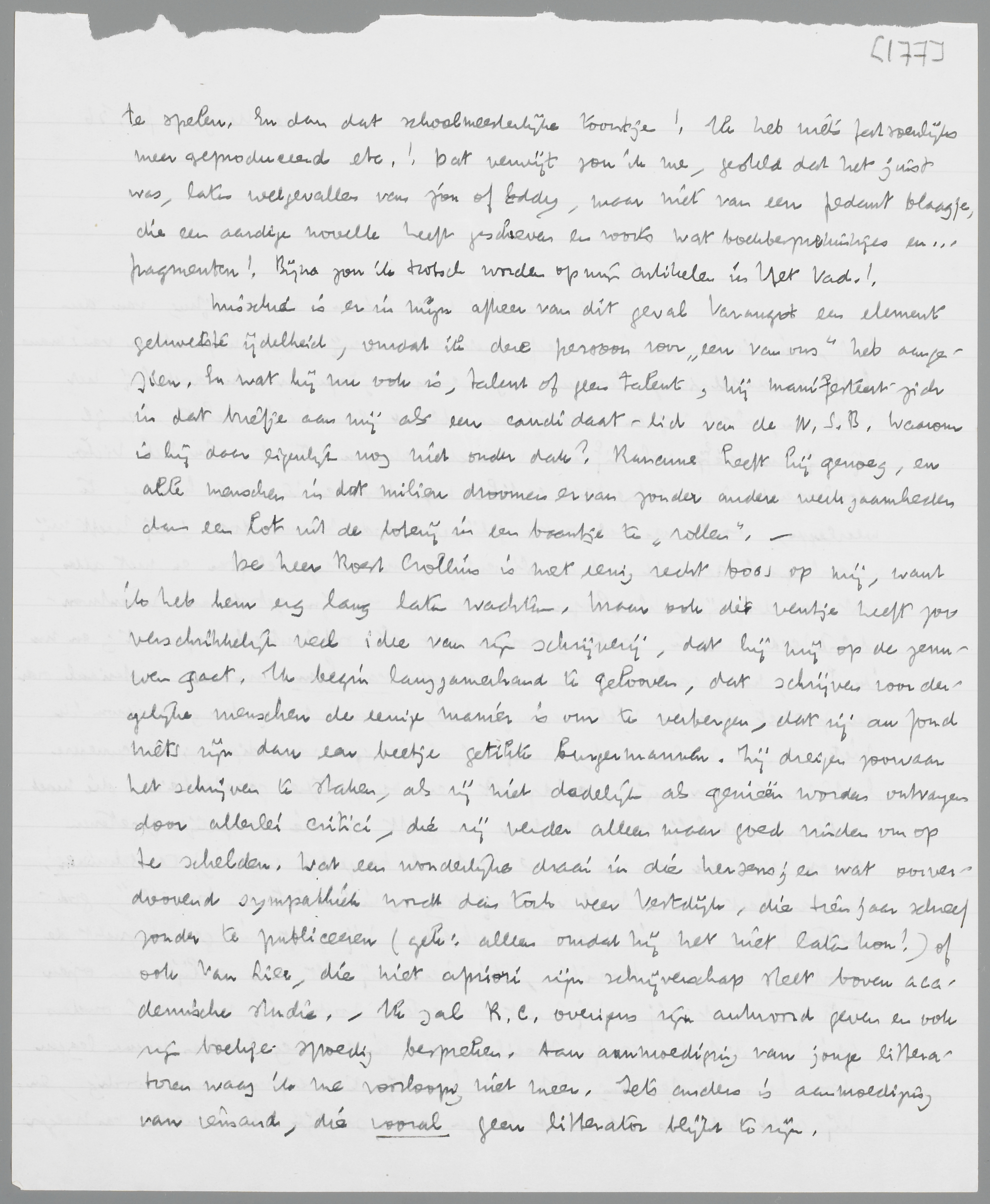 De heer Roest Crollius is met eenig recht boos op mij, want ik heb hem erg lang laten wachten. Maar ook dit ventje heeft zoo verschrikkelijk veel idee van zijn schrijverij, dat hij mij op de zenuwen gaat. Ik begin langzamerhand te gelooven, dat schrijven voor dergelijke menschen de eenige manier is om te verbergen, dat zij au fond niets zijn dan een beetje getikte burgermannen. Zij dreigen zoowaar het schrijven te staken, als zij niet dadelijk als genieën worden ontvangen door allerlei critici, die zij verder alleen maar goed vinden om op te schelden. Wat een wonderlijke draai in die hersens; en wat oorverdoovend sympathiek wordt dan toch weer Vestdijk, die tien jaar schreef zonder te publiceeren (gek: alleen omdat hij het niet laten kon!) of ook van Lier, die niet apriori zijn schrijverschap stelt boven academische studie.