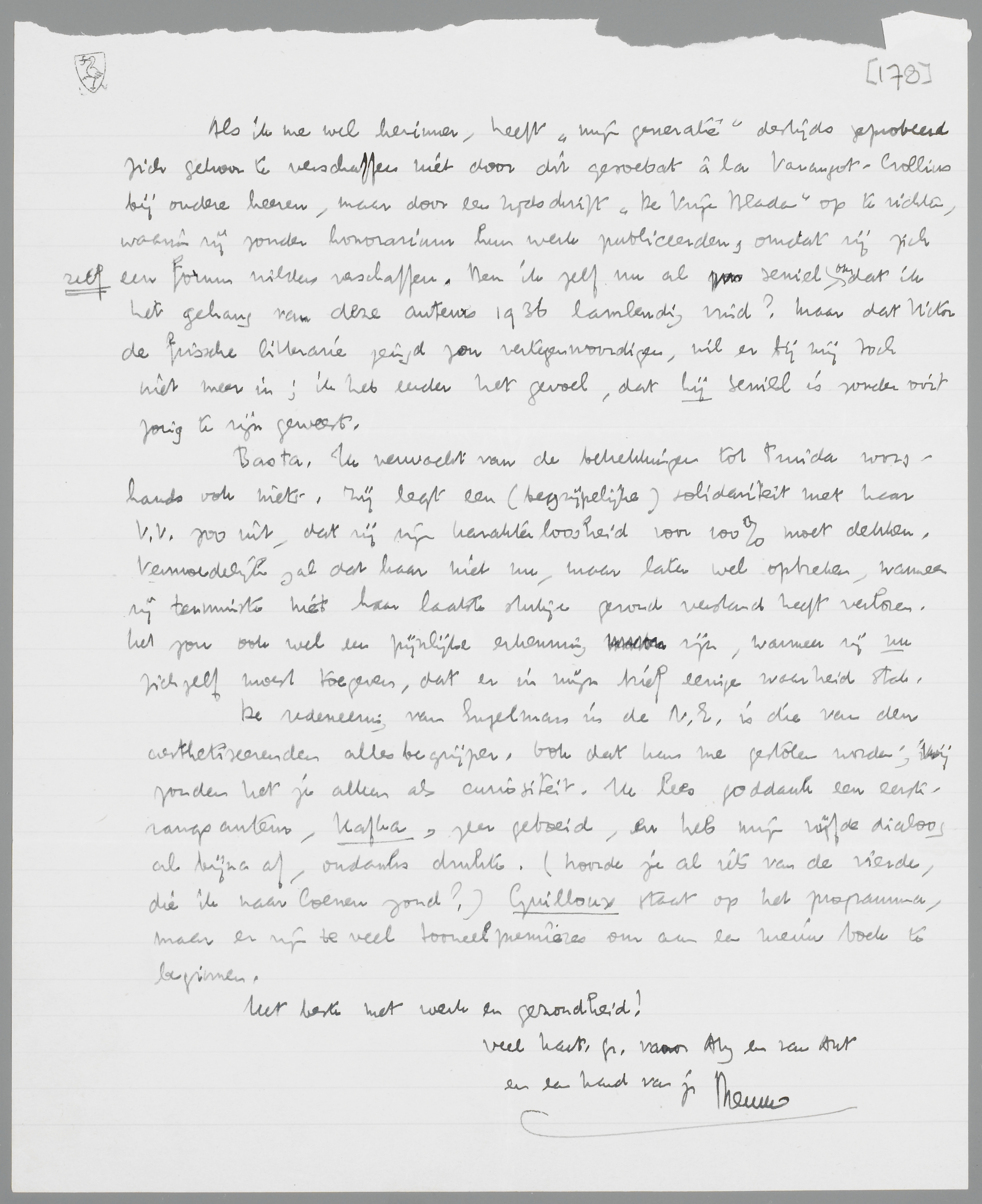 Als ik me wel herinner, heeft ‘mijn generatie’ destijds geprobeerd zich gehoor te verschaffen niet door dit gesoebat à la Varangot-Crollius bij oudere heeren, maar door een tijdschrift ‘De Vrije Bladen’ op te richten, waarin zij zonder honorarium hun werk publiceerden, omdat zij zich zelf een Forum wilden verschaffen. Ben ik zelf nu al seniel omdat ik het gehang van deze auteurs 1936 lamlendig vind? Maar dat Victor de frissche litteraire jeugd zou vertegenwoordigen, wil er bij mij toch niet meer in; ik heb eerder het gevoel, dat hij seniel is zonder ooit jong te zijn geweest.