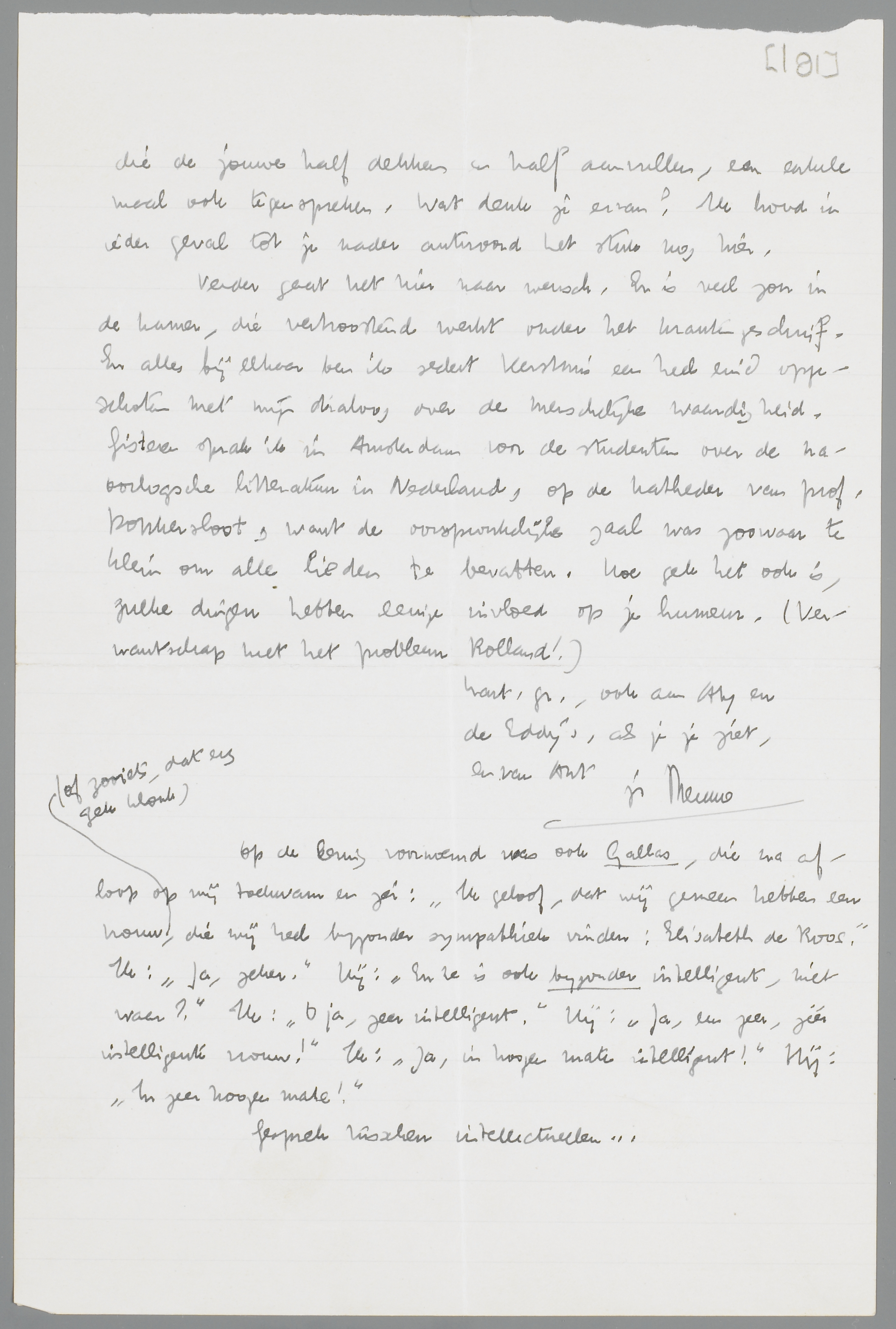 Op de lezing voornoemd was ook Gallas, die na afloop op mij toekwam en zei: ‘Ik geloof, dat wij gemeen hebben een vrouw (of zooiets, dat erg gek klonk), die wij heel byzonder sympathiek vinden: Elisabeth de Roos.’ Ik: ‘Ja, zeker.’ Hij: ‘En ze is ook byzonder intelligent, niet waar?’ Ik: ‘O ja, zeer intelligent.’ Hij: ‘Ja, een zeer, zéér intelligente vrouw!’ Ik: ‘Ja, in hoogen mate intelligent!’ Hij: ‘In zeer hoogen mate!’