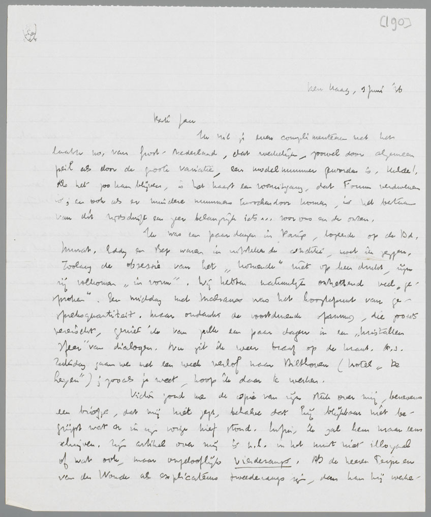 Ik wil je even complimenteeren met het laatste no. van Groot-Nederland, dat werkelijk, zoowel door algemeen peil als door de groote variatie, een modelnummer geworden is. Hulde! Als het zoo kan blijven, is het haast een vooruitgang, dat Forum verdwenen is; en ook als er mindere nummers tusschendoor komen, is het bestaan van dit tijdschrift een zeer belangrijk iets... voor ons en de onzen.