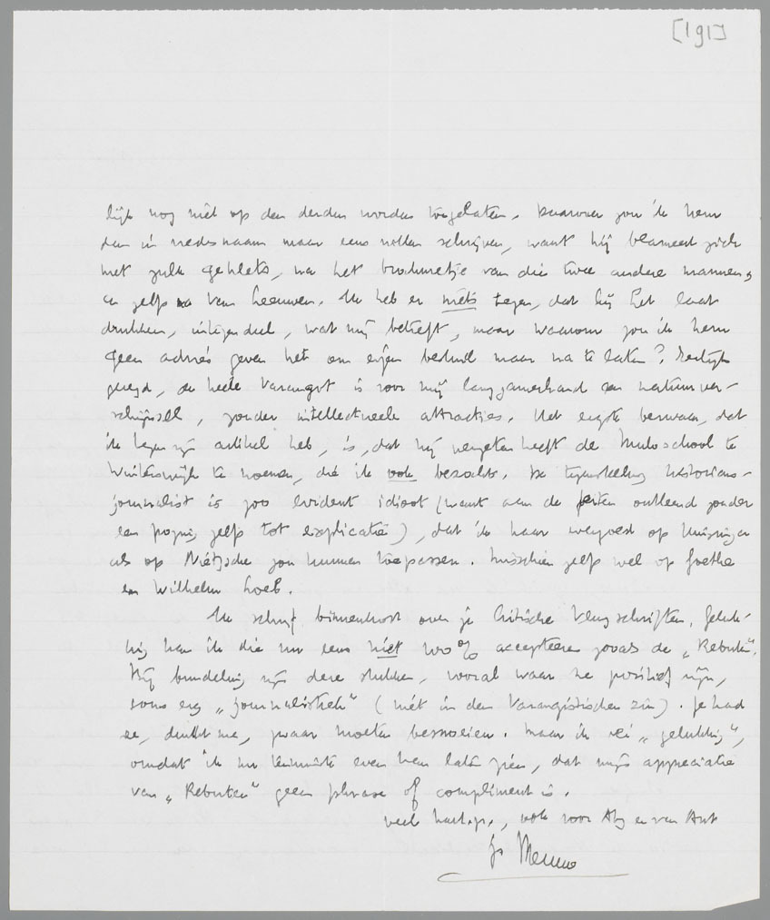 Ik schrijf binnenkort over je Critische Vlugschriften. Gelukkig kan ik die nu eens niet 100% accepteeren zooals de ‘Rebuten’. Bij bundeling zijn deze stukken, vooral waar ze positief zijn, soms erg ‘journalistiek’ (niet in den Varangistischen zin). Je had ze, dunkt me, zwaar moeten besnoeien. Maar ik zei ‘gelukkig’, omdat ik nu tenminste even kan laten zien, dat mijn appreciatie van ‘Rebuten’ geen phrase of compliment is.
