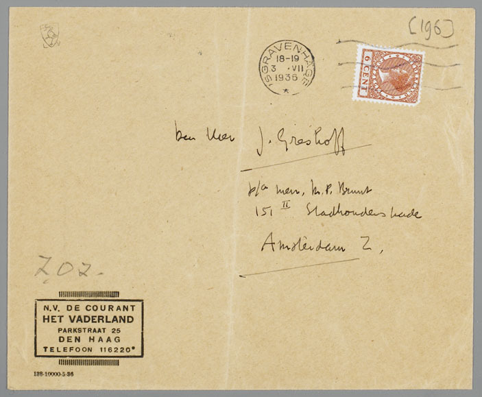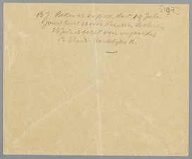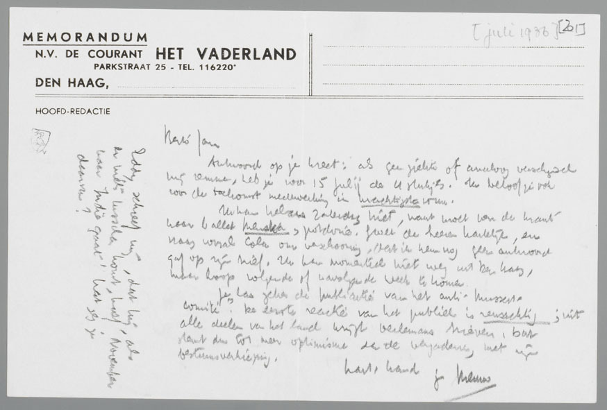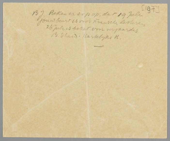B.J. Reken er s.v.p. op, dat 19 Juli jouw beurt is voor Fransche letteren. 26 Juli is bezet voor verjaardag B. Shaw. Hartelijks M.