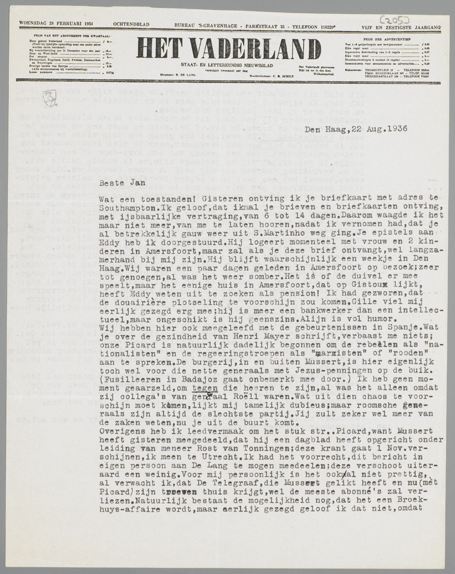 Wij hebben hier ook meegeleefd met de gebeurtenissen in Spanje. Wat je over de gezindheid van Henri Mayer schrijft, verbaast me niets; onze Picard is natuurlijk dadelijk begonnen om de rebellen als ‘nationalisten’ en de regeeringstroepen als ‘marxisten’ of ‘rooden’ aan te spreken. De burgerij, in en buiten Mussert, is hier eigenlijk toch wel voor die nette generaals met Jezus-penningen op de buik. (Fusilleeren in Badajoz gaat onbemerkt mee door.) Ik heb geen moment geaarzeld, om tegen die heeren te zijn, al was het alleen omdat zij collega's van generaal Roëll waren. Wat uit dien chaos te voorschijn moet komen, lijkt mij tamelijk dubieus; maar roomsche generaals zijn altijd de slechtste partij. Jij zult zeker wel meer van de zaken weten, nu je uit de buurt komt.