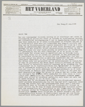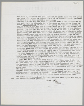 Wat het weer betreft, mogen jullie van geluk spreken. Wij hadden allerberoerdst weer, ook die paar dagen in Vlissingen. Dit had het voordeel, dat ik hard gewerkt heb en nu op p. 180 van mijn manuscript ben aangekomen. Helaas loopt de zaak meer uit dan ik dacht, zoodat ik wel niet voor eind September de streep zal kunnen zetten, die mij weervooreen tijdje tot vrij man maakt. Gelukkig was het in het vak tot dusverre kalm, zoodat ik ook hier gewerkt heb. Het boek zal waarschijnlijk heeten ‘Christelijk Europa’.
