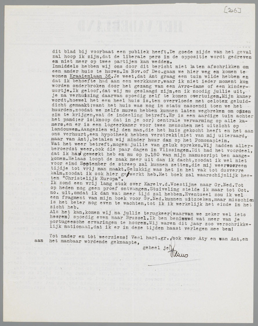 Inmiddels hebben wij ons door dit bericht niet laten afschrikken om een ander huis te huren. In Nov. of Dec. gaan we hier weg en komen te wonen Kraaienlaan 36. Je weet, dat Ant graag een tuin wilde hebben en dat ik behoefte had aan een werkkamer, waar ik niet ieder moment kon worden onderbroken door het gezang van een Avro-dame of een kinderuurtje. Ik geloof, dat wij nu geslaagd zijn, en ik noodig jullie uit, je na verhuizing daarvan spoedig zelf te komen overtuigen. Mijn kamer wordt, hoewel het een heel huis is, ten overvloede met celotex geluiddicht gemaakt; want het huis was nog in statu nascendi toen we het huurden, zoodat we zelfs muren hebben kunnen laten wegbreken om onzen zin te krijgen, wat de indeeling betreft. Er is een aardige tuin achter het pand; er is (knoop dat in je oor) centrale verwarming op alle kamers, en er is een logeerkamer voor twee menschen met uitzicht op landouwen. Aangezien wij den man, die het huis gekocht heeft en het aan ons verhuurt, een hypotheek hebben verstrekt (niet van mij uiteraard, maar van Ant), betalen wij minder huur dan op het Pomonaplein.