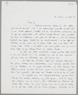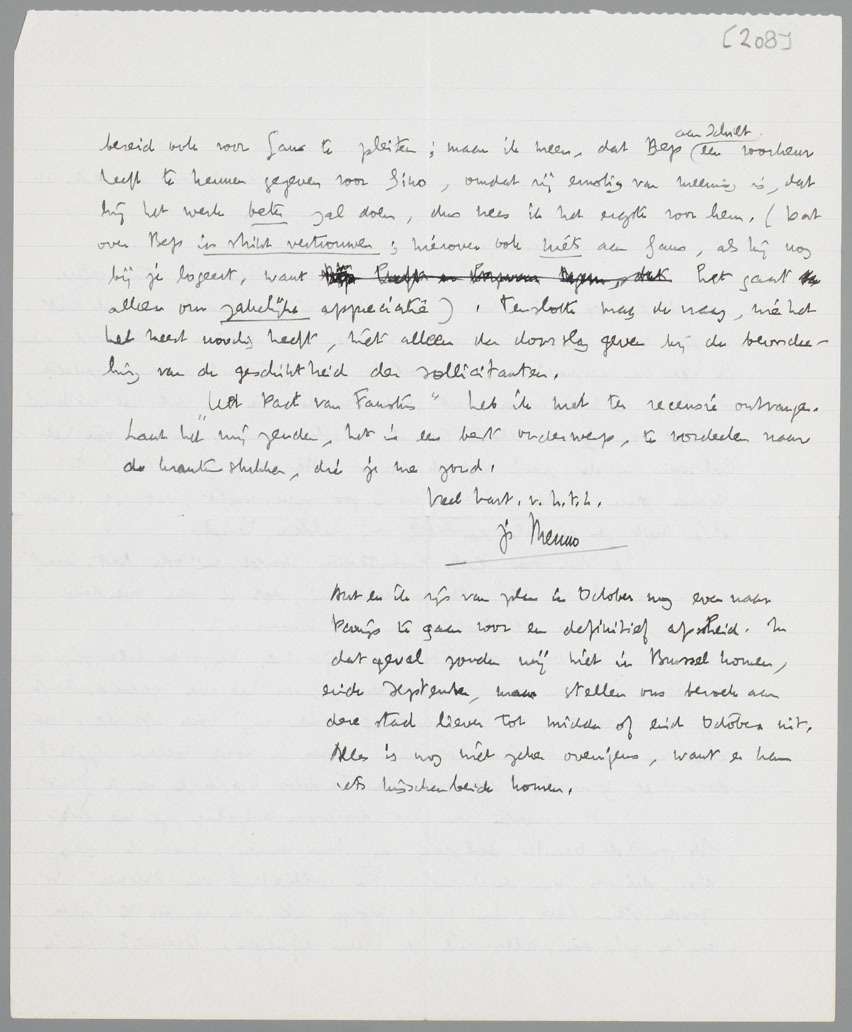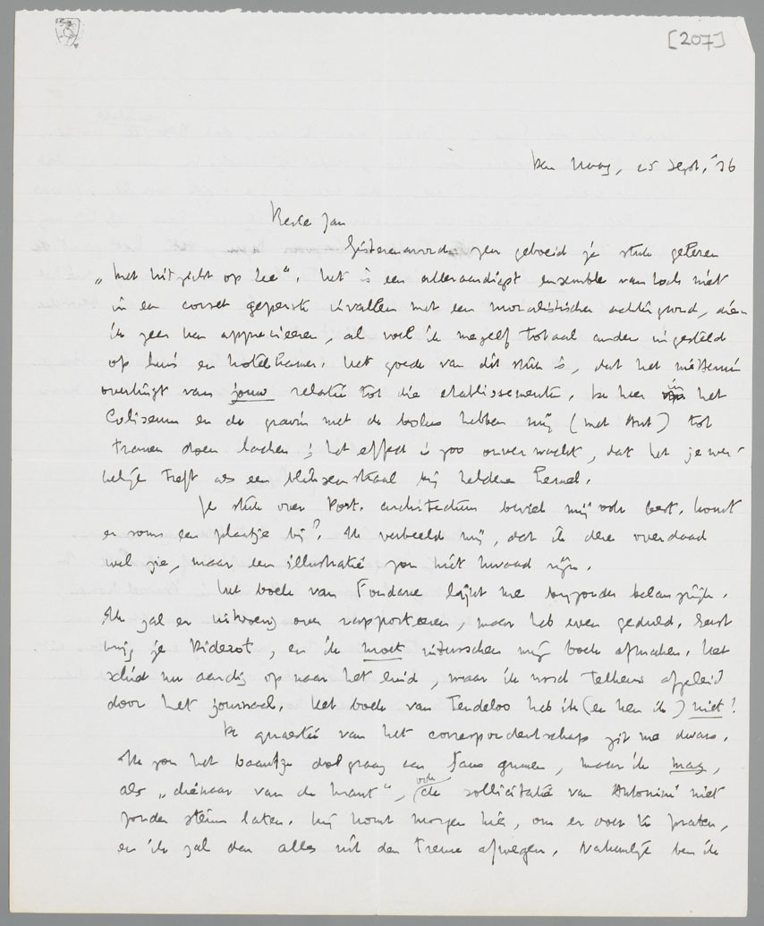 Gisterenavond zeer geboeid je stuk gelezen ‘Met Uitzicht op Zee’. Het is een alleraardigst ensemble van toch niet in corset geperste invallen met een moralistischen achtergrond, dien ik zeer kan apprecieeren, al voel ik mezelf totaal anders ingesteld op huis en hotelkamer. Het goede van dit stuk is, dat het niettemin overtuigt van jouw relatie tot die etablissementen. De heer in het Coliseum en de gravin met de bolus hebben mij (met Ant) tot tranen doen lachen; het effect is zoo onverwacht, dat het je werkelijk treft als een bliksemstraal bij helderen hemel.