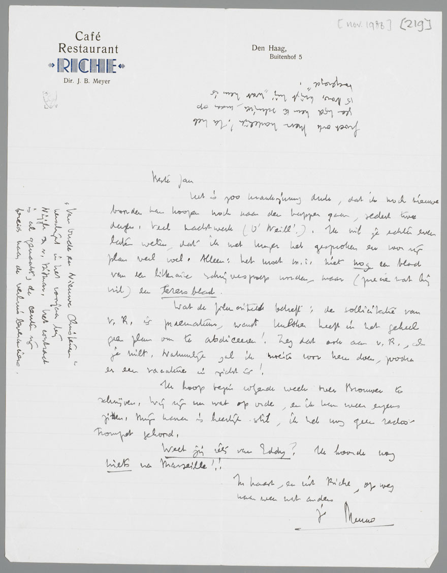 Het is zoo krankzinnig druk, dat ik noch nieuwe boorden kan koopen noch naar de kapper gaan, sedert twee dagen. Veel nachtwerk (O'Neill!). Ik wil je echter even laten weten, dat ik met Mayer heb gesproken en voor zijn plan veel voel. Alleen: het moet m.i. niet nog een blad van een litteraire schrijversgroep worden, maar (precies wat hij wil) een lezersblad.