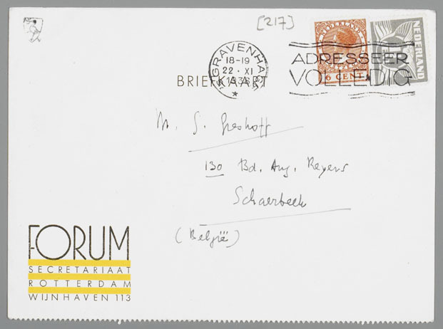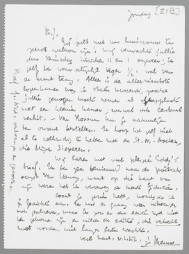 Gij zult met uw huisvrouw ten zeerste welkom zijn! Wij verwachten jullie dus Dinsdag tusschen 11 en 1 ongeveer; ik zelf ben waarschijnlijk tegen ½1 wel van de krant terug. Alleen is de allerriantste logeerkamer nog in statu nascendi, zoodat jullie genoegen moeten nemen als slaapplaats met een kleinere kamer, evenwel ook centraal verhit. - Van Rossum kun je natuurlijk ten onzent bestellen. Ik hoop het zelf niet al te volhandig te hebben met de St.N.-boeken, die blijven Sieperen.
