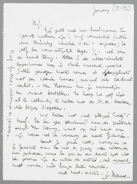 Wij lazen met veel pleizier Eddy's brief. Ik ben zeer benieuwd naar de poëtische oogst van Henny, want op die kant van zijn wezen heb ik verreweg de meeste fiducies.