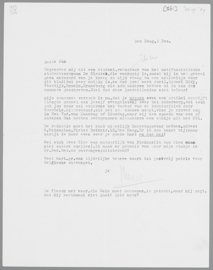 Tegenover mij zit een student, redacteur van het antifascistische studentenorgaan De Sleutel, die wanhopig is, omdat hij in het geheel geen antwoord van je kreeg op zijn vraag om een artikeltje voor dit blad (dat zeer nuttig is, en dat goed werk doet). Zoowel Eddy, Vestdijk, Romein, Kraneburg als ook ik en anderen hebben al in een der nummers geschreven. Stel dus deze goedwillenden niet teleur!