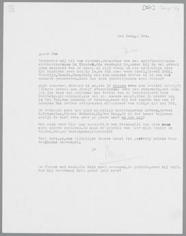 Mijn concreet verzoek is nu, dat je morgen even een artikel schrijft (lengte geheel aan jezelf overgelaten) over het onderwerp, dat toch ook jou zeer zal ergeren: het verbod van de kunstcritiek door Goebbels. Litteratuur, als het zoo noemen moogt, vind je erover nog in Het Vad. van Maandag of Dinsdag, waar wij een speech van een of anderen Rat hebben overgenomen mitsgaders een stukje uit het Hbl.