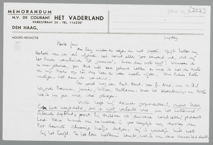 Victor heeft mij excuses gepresenteerd, omdat Merz hem had meegedeeld, dat ik niet verkocht was aan het nationaal-liberale dagblad, zooals hij blijkbaar tot dusverre hardnekkig gedacht had. Deze manier van excuseeren is zoo mogelijk nog dwazer dan het bewuste schunnige briefje destijds. Hij is werkelijk niet wel bij het hoofd. Ik heb hem niettemin bericht, wat ik van deze dwaasheid dacht.