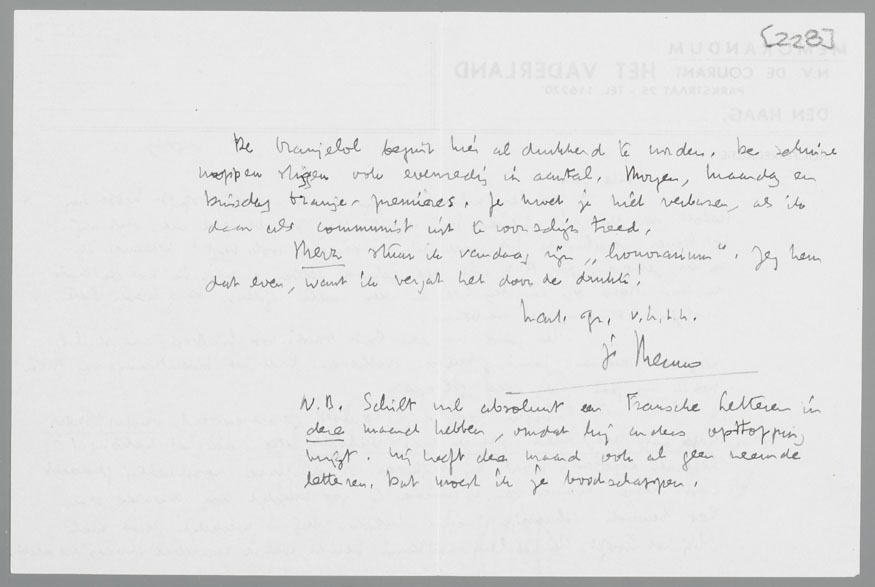 N.B. Schilt wil absoluut een Fransche Letteren in deze maand hebben, omdat hij anders opstopping krijgt. Hij heeft deze maand ook al geen vreemde letteren. Dat moest ik je boodschappen.