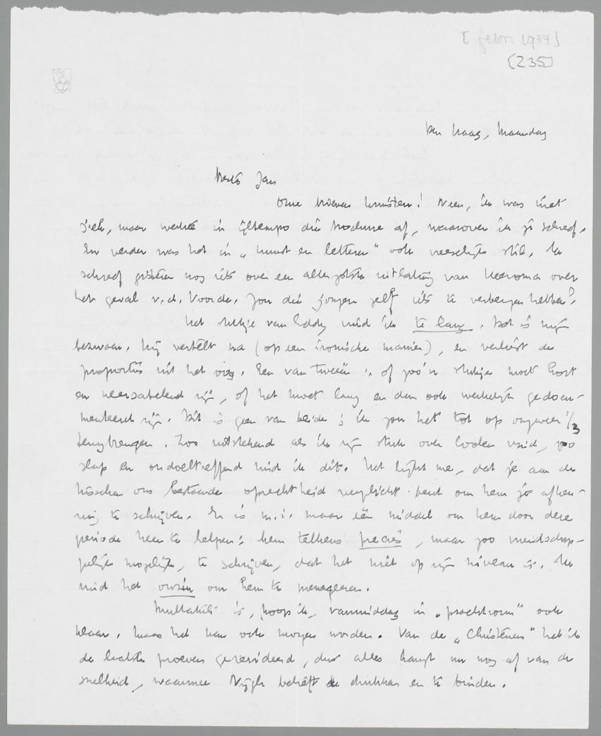 Het stukje van Eddy vind ik te lang. Dat is mijn bezwaar. Hij vertelt na (op een ironische manier), en verliest de proporties uit het oog. Een van tweeën: of zoo'n stukje moet kort en neersabelend zijn, of het moet lang en dan ook werkelijk gedocumenteerd zijn. Dit is geen van beide; ik zou het tot op ongeveer 1/3 terugbrengen. Zoo uitstekend als ik zijn stuk over Coolen vind, zoo slap en ondoeltreffend vind ik dit. Het lijkt me, dat je aan de tusschen ons bestaande oprechtheid verplicht bent om hem je afkeuring te schrijven. Er is m.i. maar één middel om hem door deze periode heen te helpen: hem telkens precies, maar zoo vriendschappelijk mogelijk, te schrijven, dat het niet op zijn niveau is. Ik vind het onzin om hem te menageeren.