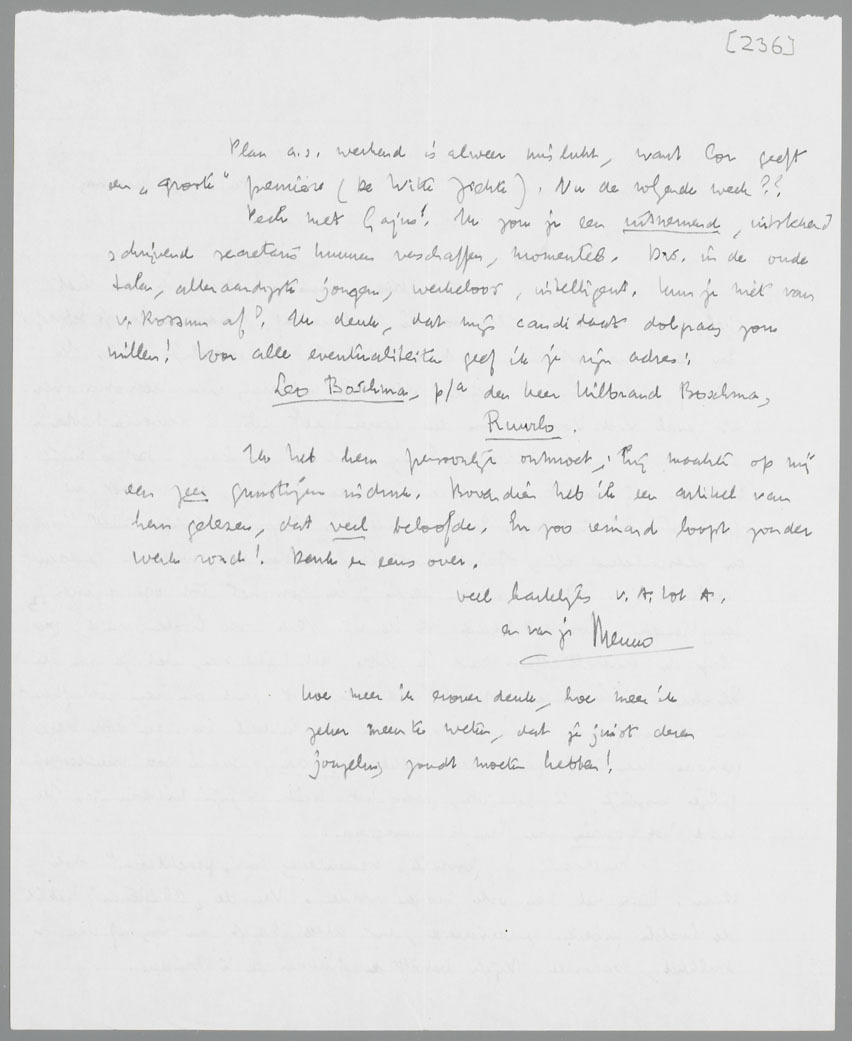 Pech met Gajus! Ik zou je een uitnemend, uitstekend schrijvend secretaris kunnen verschaffen, momenteel. Drs. in de oude talen, alleraardigste jongen, werkeloos, intelligent. Kun je niet van v. Rossum af? Ik denk, dat mijn candidaat dolgraag zou willen! Voor alle eventualiteiten geef ik je zijn adres: Leo Boschma, p/a den heer Hilbrand Boschma, Ruurlo.