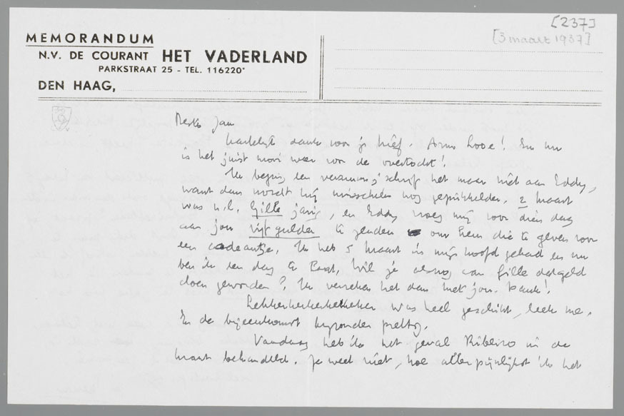Ik beging een verzuiming; schrijf het maar niet aan Eddy, want dan wordt hij misschien nog geprikkelder. 2 Maart was n.l. Gille jarig, en Eddy vroeg mij voor dien dag aan jou vijf gulden te zenden om hem die te geven voor een cadeautje. Ik heb 5 Maart in mijn hoofd gehad en nu ben ik een dag te laat. Wil je alsnog aan Gille dat geld doen geworden? Ik verreken het dan met jou. Dank!