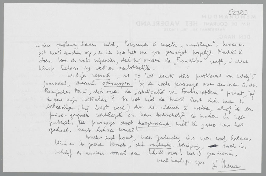 Wil je vooral, als je het eerste stuk publiceert van Eddy's Journaal, daarin schrappen òf de heele passage over den man in den Parijschen trein, die over de ‘abdicatie van Fontainebleau’ praat, òf anders mijn initialen? Ik heb niet de minste lust dien man te beleedigen (hij leest veel) door den indruk te wekken, alsof ik een privé-gesprek verklapte om hem belachelijk te maken in het publiek. De passage doet hoegenaamd niets ter zake voor het geheel. Denk hieraan vooral!
