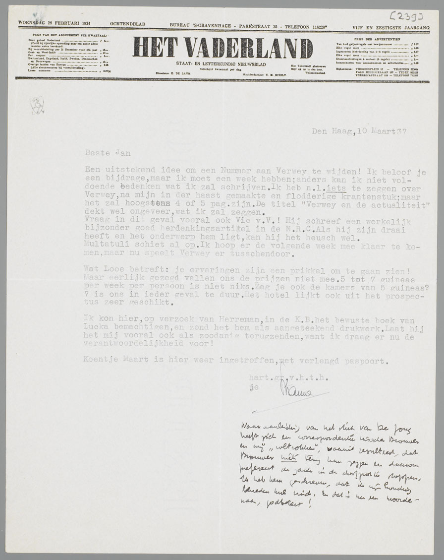 Een uitstekend idee om een Nummer aan Verwey te wijden! Ik beloof je een bijdrage, maar ik moet een week hebben; anders kan ik niet voldoende bedenken wat ik zal schrijven. Ik heb n.l. iets te zeggen over Verwey, na mijn in der haast gemaakte en flodderige krantenstuk; maar het zal hoogstens 4 of 5 pag. zijn. De titel ‘Verwey en de actualiteit’ dekt wel ongeveer, wat ik zal zeggen.