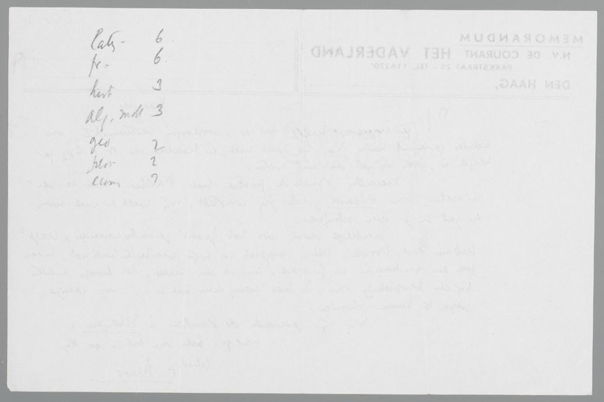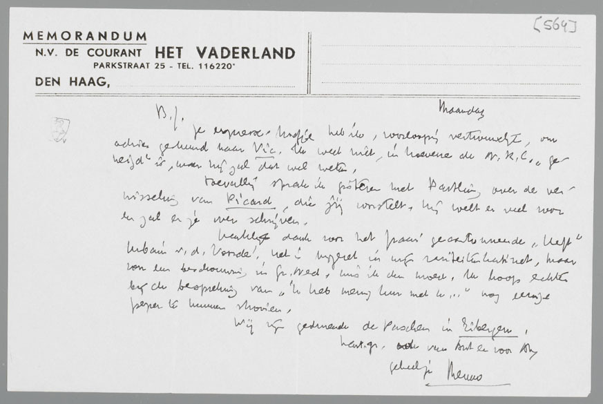 Je expresse-briefje heb ik, voorloopig vertrouwelijk, om advies gestuurd naar Vic. Ik weet niet, in hoeverre de N.R.C. ‘geneigd’ is, maar hij zal dat wel weten.