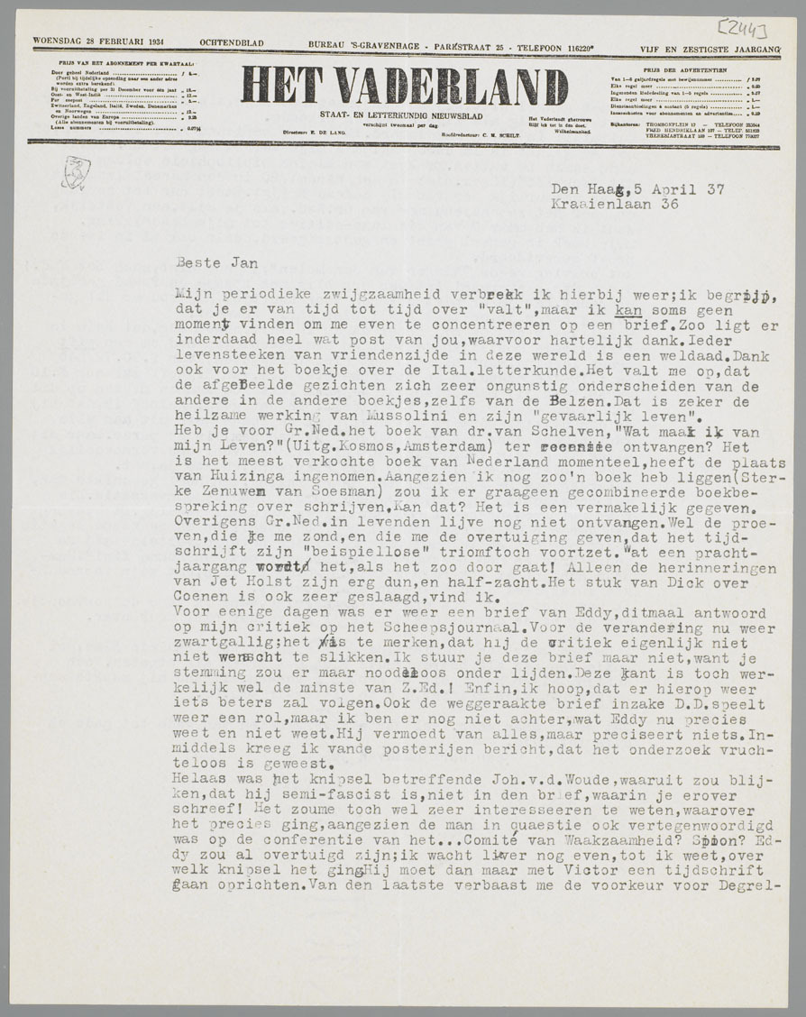 Helaas was het knipsel betreffende Joh.v.d. Woude, waaruit zou blijken, dat hij semi-fascist is, niet in den brief, waarin je erover schreef! Het zou me toch wel zeer interesseeren te weten, waarover het precies ging, aangezien de man in quaestie ook vertegenwoordigd was op de conferentie van het... Comité van Waakzaamheid? Spion? Eddy zou al overtuigd zijn; ik wacht liever nog even, tot ik weet, over welk knipsel het ging. Hij moet dan maar met Victor een tijdschrift gaan oprichten. Van den laatste verbaast me de voorkeur voor Degrel[le] in het geheel niet. Hij zou inconsequent zijn, als hij zoo'n leider niet volmondig als zijn superieur erkende.