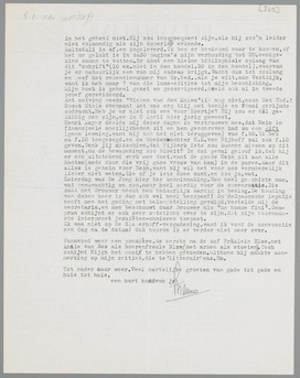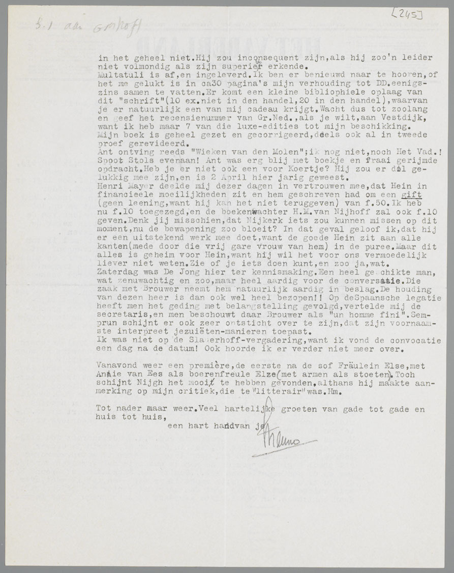 Henri Mayer deelde mij dezer dagen in vertrouwen mee, dat Hein in financieele moeilijkheden zit en hem geschreven had om een gift (geen leening, want hij kan het niet teruggeven) van f.50. Ik heb nu f.10 toegezegd, en de boekenwachter H.M. van Nijhoff zal ook f.10 geven. Denk jij misschien, dat Nijkerk iets zou kunnen missen op dit moment, nu de bewapening zoo bloeit? In dat geval geloof ik, dat hij er een uitstekend werk mee doet, want de goede Hein zit aan alle kanten (mede door die vrij gare vrouw van hem) in de puree. Maar dit alles is geheim voor Hein, want hij wil het voor ons vermoedelijk liever niet weten. Zie of je iets doen kunt, en zoo ja, wat.