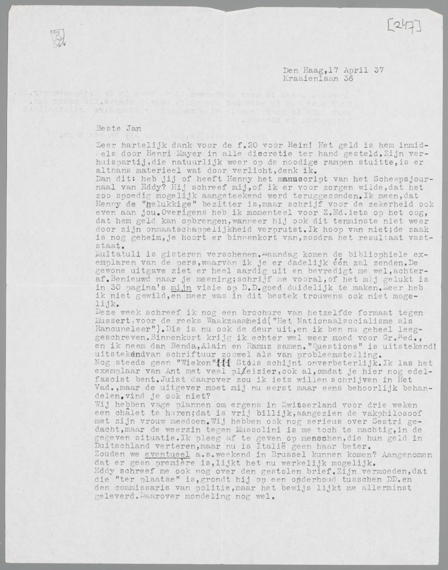 Dan dit: heb jij of heeft Henny het manuscript van het Scheepsjournaal van Eddy? Hij schreef mij, of ik er voor zorgen wilde, dat het zoo spoedig mogelijk aangeteekend werd teruggezonden. Ik meen, dat Henny de ‘gelukkige’ bezitter is, maar schrijf voor de zekerheid ook even aan jou. Overigens heb ik momenteel voor Z.Ed. iets op het oog, dat hem geld kan opbrengen, wanneer hij ook dit tenminste niet weer door zijn onmaatschappelijkheid verprutst. Ik hoop van niet; de zaak is nog geheim, je hoort er binnenkort van, zoodra het resultaat vaststaat.