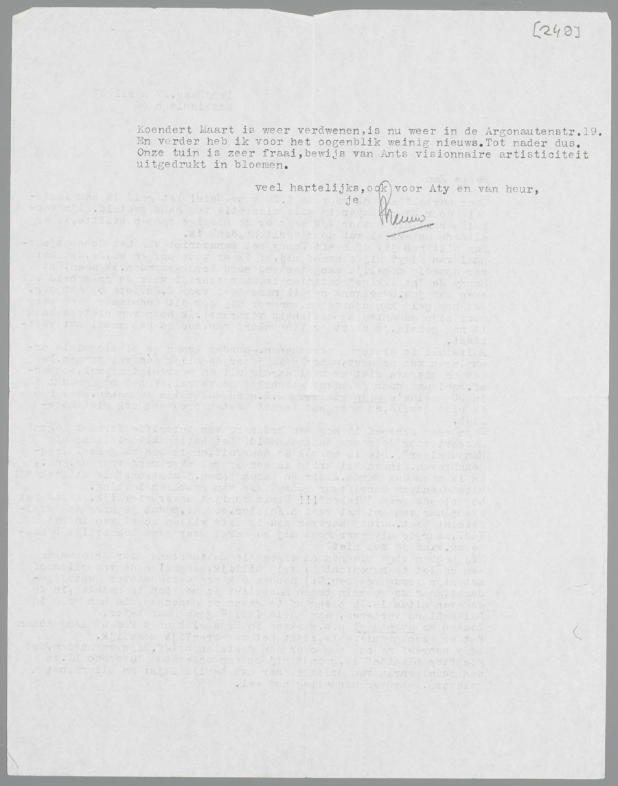 Koendert Maart is weer verdwenen, is nu weer in de Argonautenstr. 19. En verder heb ik voor het oogenblik weinig nieuws. Tot nader dus. Onze tuin is zeer fraai, bewijs van Ants visionnaire artisticiteit uitgedrukt in bloemen.