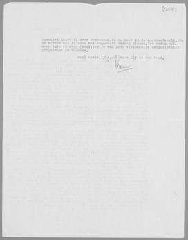Nog steeds geen ‘Wieken’. Stols schijnt onverbeterlijk. Ik las het exemplaar van Ant met veel pleizier, ook al, omdat je hier nog edelfascist bent. Juist daarover zou ik iets willen schrijven in Het Vad., maar de uitgever moet mij nu eerst maar eens behoorlijk behandelen, vind je ook niet?