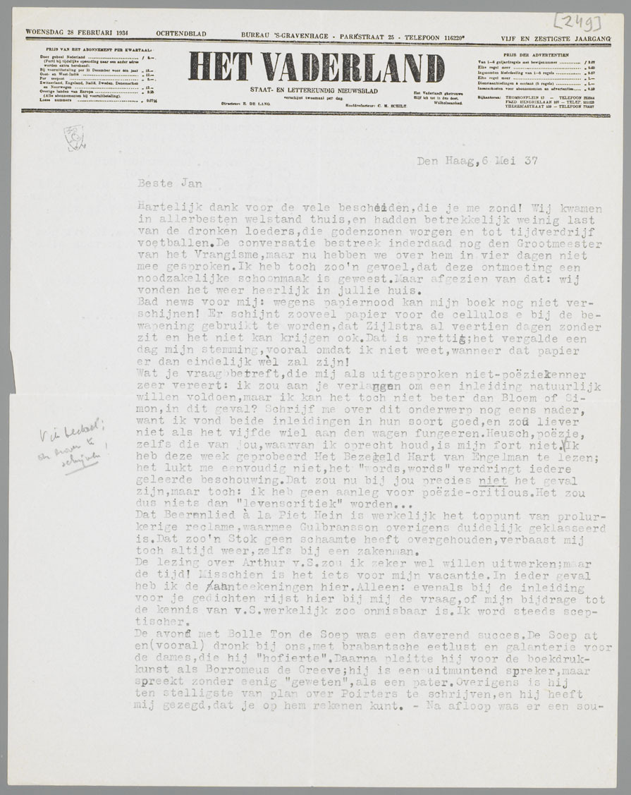 De lezing over Arthur v.S. zou ik zeker wel willen uitwerken; maar de tijd! Misschien is het iets voor mijn vacantie. In ieder geval heb ik de aanteekeningen hier. Alleen: evenals bij de inleiding voor je gedichten rijst hier bij mij de vraag, of mijn bijdrage tot de kennis van v.S. werkelijk zoo onmisbaar is. Ik word steeds sceptischer.