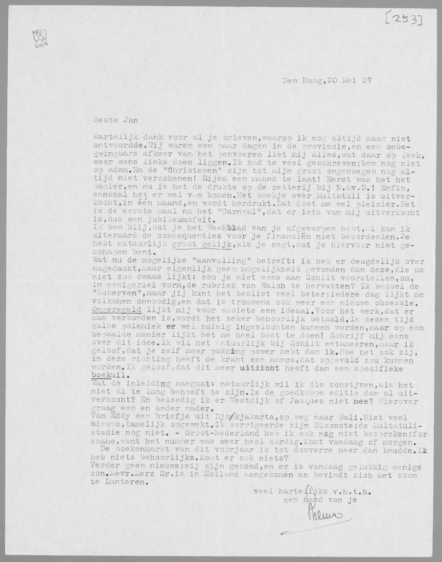 Hartelijk dank voor al je brieven, waarop ik nog altijd maar niet antwoordde. Wij waren een paar dagen in de provincie, en een onbedwingbare afkeer van het penvoeren liet mij alles, wat daar op leek, weer eens links doen liggen. Ik had te veel geschreven; ben nog niet op adem. En de ‘Christenen’ zijn tot mijn groot ongenoegen nog altijd niet verschenen! Bijna een maand te laat! Eerst was het het papier, en nu is het de drukte op de zetterij bij N.&v.D.! Enfin, eens zal het er wel van komen. Het boekje over Multatuli is uitverkocht, in één maand, en wordt herdrukt. Dat doet me wel pleizier. Het is de eerste maal na het ‘Carnaval’, dat er iets van mij uitverkocht is, dus een jubileumfeit.
