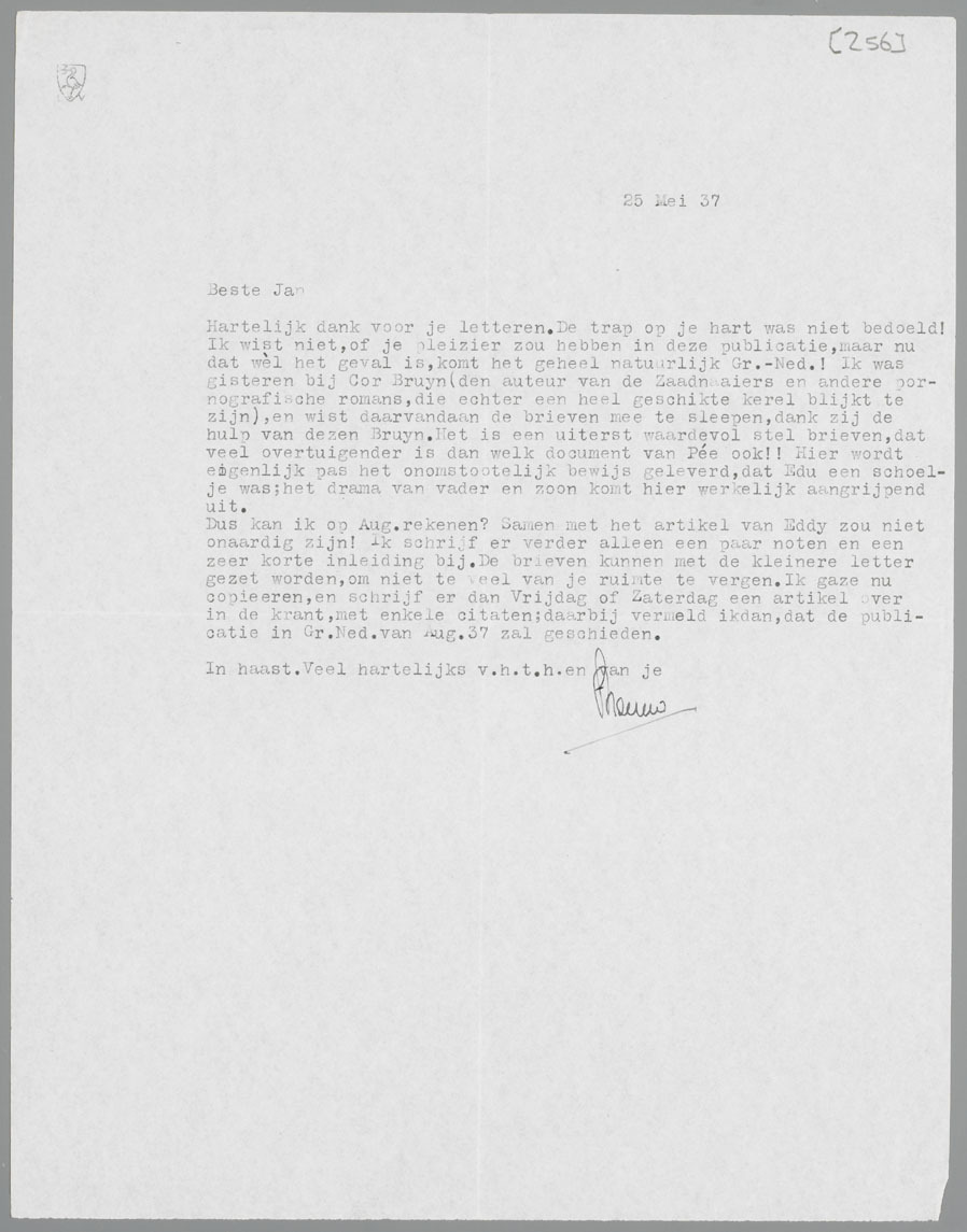 Hartelijk dank voor je letteren. De trap op je hart was niet bedoeld! Ik wist niet, of je pleizier zou hebben in deze publicatie, maar nu dat wèl het geval is, komt het geheel natuurlijk Gr. Ned.! Ik was gisteren bij Cor Bruyn (den auteur van de Zaadnaaiers en andere pornografische romans, die echter een heel geschikte kerel blijkt te zijn), en wist daarvandaan de brieven mee te sleepen, dank zij de hulp van dezen Bruyn. Het is een uiterst waardevol stel brieven, dat veel overtuigender is dan welk document van Pée ook!! Hier wordt eigenlijk pas het onomstootelijk bewijs geleverd, dat Edu een schoelje was; het drama van vader en zoon komt hier werkelijk aangrijpend uit.