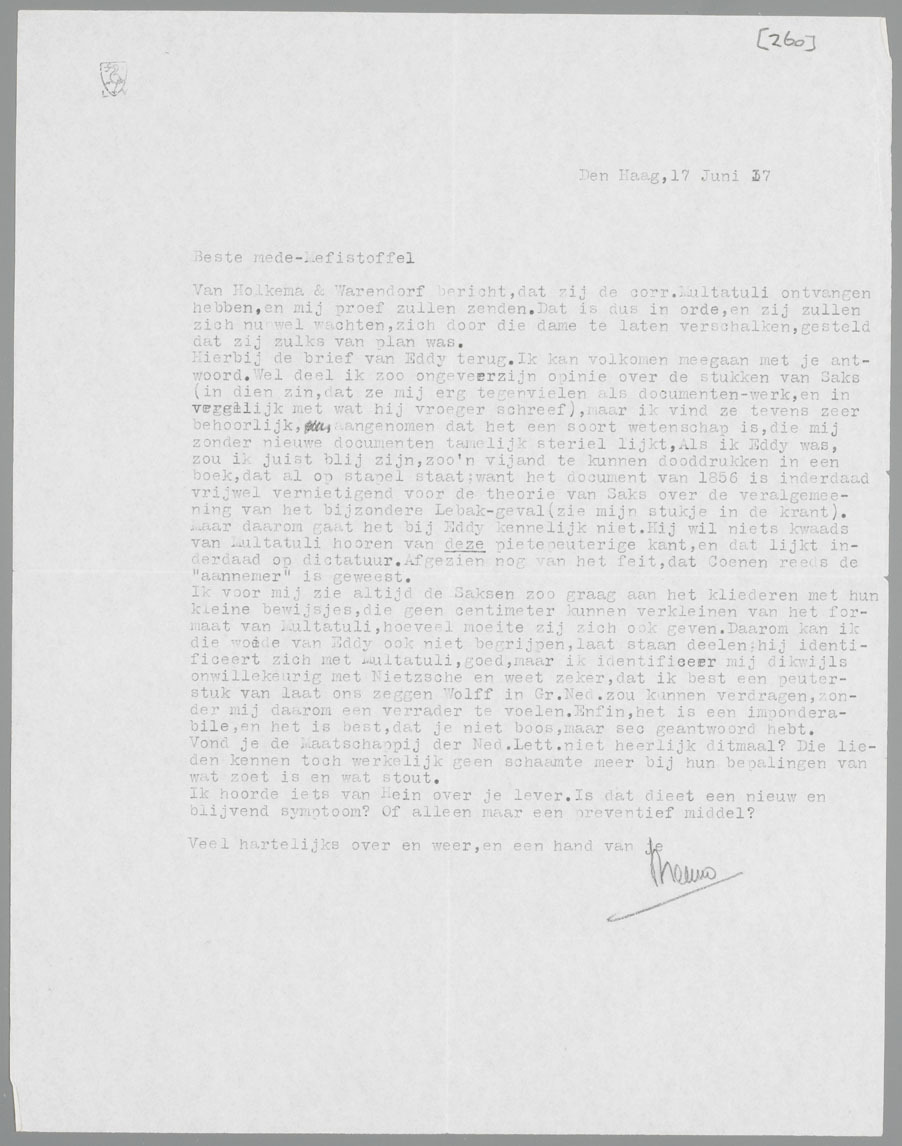 Hierbij de brief van Eddy terug. Ik kan volkomen meegaan met je antwoord. Wel deel ik zoo ongeveer zijn opinie over de stukken van Saks (in dien zin, dat ze mij erg tegenvielen als documenten-werk, en in vergelijk met wat hij vroeger schreef), maar ik vind ze tevens zeer behoorlijk, aangenomen dat het een soort wetenschap is, die mij zonder nieuwe documenten tamelijk steriel lijkt. Als ik Eddy was, zou ik juist blij zijn, zoo'n vijand te kunnen dooddrukken in een boek, dat al op stapel staat; want het document van 1856 is inderdaad vrijwel vernietigend voor de theorie van Saks over de veralgemeening van het bijzondere Lebak-geval (zie mijn stukje in de krant). Maar daarom gaat het bij Eddy kennelijk niet. Hij wil niets kwaads van Multatuli hooren van deze pietepeuterige kant, en dat lijkt inderdaad op dictatuur. Afgezien nog van het feit, dat Coenen reeds de ‘aannemer’ is geweest.