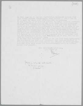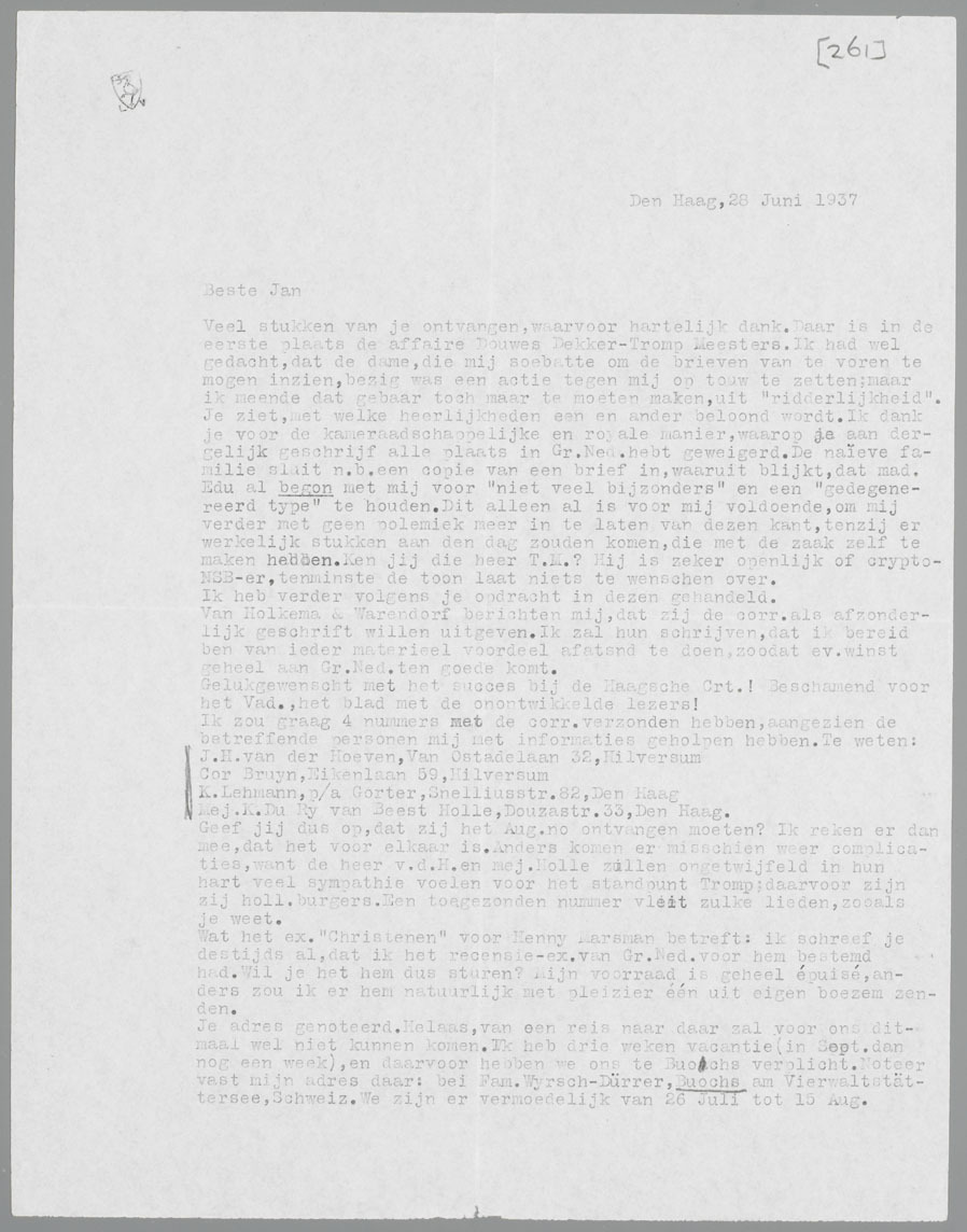 Van Holkema & Warendorf berichten mij, dat zij de corr. als afzonderlijk geschrift willen uitgeven. Ik zal hun schrijven, dat ik bereid ben van ieder materieel voordeel afstand te doen, zoodat ev. winst geheel aan Gr.Ned. ten goede komt.