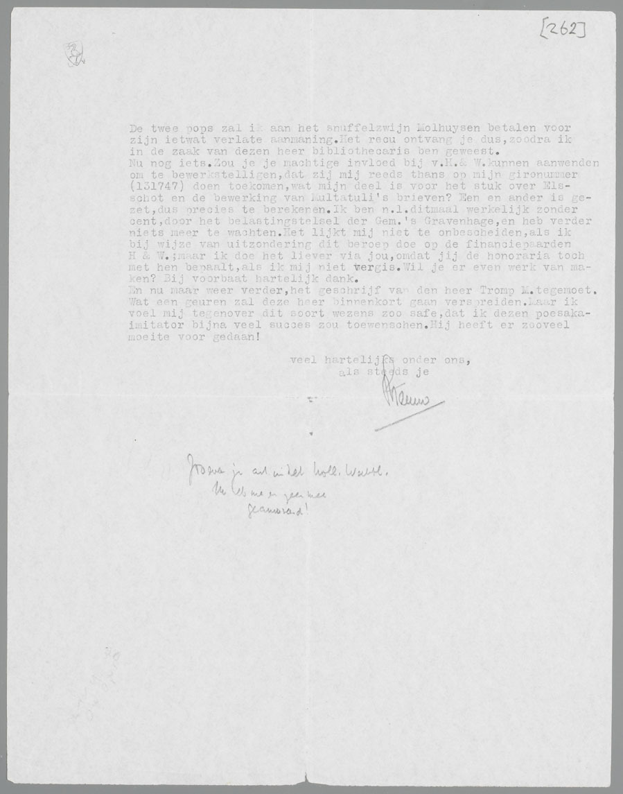 De twee pops zal ik aan het snuffelzwijn Molhuysen betalen voor zijn ietwat verlate aanmaning. Het recu ontvang je dus, zoodra ik in de zaak van dezen heer bibliothecaris ben geweest.