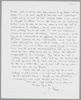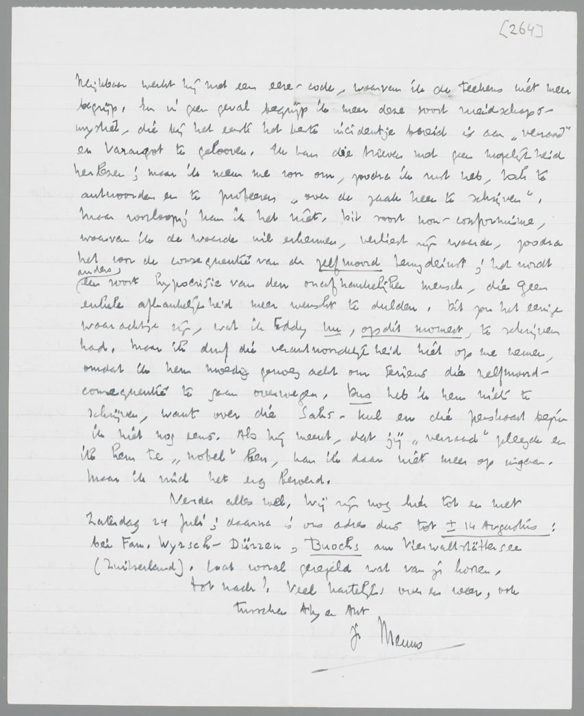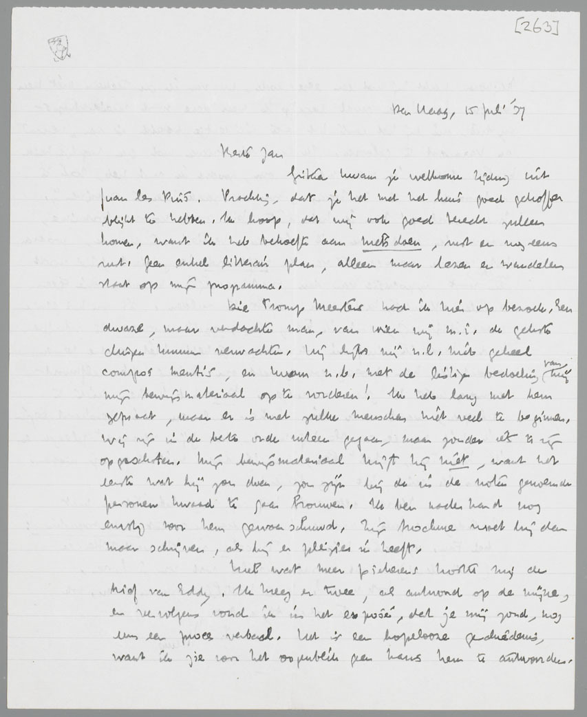 Heel wat meer piekerens kostte mij de brief van Eddy. Ik kreeg er twee, als antwoord op de mijne, en vervolgens vond ik in het exposé, dat je mij zond, nog eens een proces verbaal. Het is een hopelooze geschiedenis, want ik zie voor het oogenblik geen kans hem te antwoorden. Blijkbaar werkt hij met een eere-code, waarvan ik de teekens niet meer begrijp. En in geen geval begrijp ik meer deze soort vriendschapsmystiek, die hij in het eerste het beste incidentje bereid is aan ‘verraad’ en Varangot te gelooven. Ik kan die brieven met geen mogelijkheid herlezen; maar ik neem me voor om, zoodra ik rust heb, toch te antwoorden en te probeeren ‘over de zaak heen te schrijven’. Maar voorloopig kan ik het niet. Dit soort non-conformisme, waarvan ik de waarde wil erkennen, verliest zijn waarde, zoodra het voor de consequentie van de zelfmoord terugdeinst; het wordt anders een soort hypocrisie van den onafhankelijken mensch, die geen enkele afhankelijkheid meer wenscht te dulden. Dit zou het eenige waarachtige zijn, wat ik Eddy nu, op dit moment, te schrijven had. Maar ik durf die verantwoordelijkheid niet op me nemen, omdat ik hem moedig genoeg acht om serieus die zelfmoordconsequentie te gaan overwegen. Dus heb ik hem niets te schrijven, want over die Saks-kul en die perskaart begin ik niet nog eens. Als hij meent, dat jij ‘verraad’ pleegde en ik hem te ‘nobel’ ben, kan ik daar niet meer op ingaan. Maar ik vind het erg beroerd.